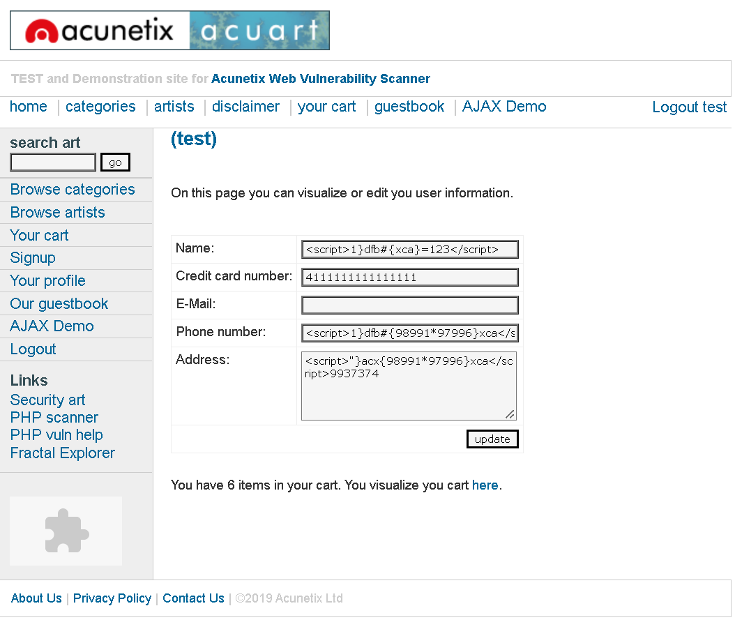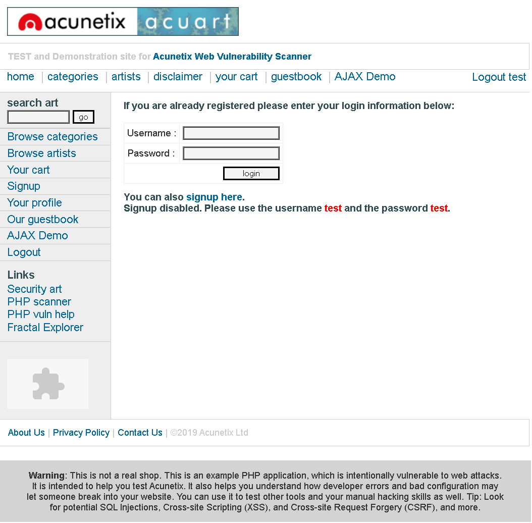 welcome to our page Test site for Acunetix WVS. Warning: This is not a real shop. This is an example PHP application, which is intentionally vulnerable to web attacks. It is intended to help you test Acunetix. It also helps you understand how developer err