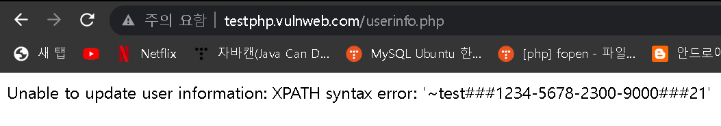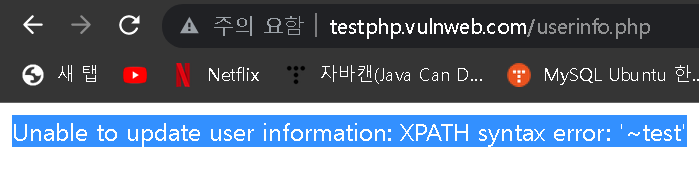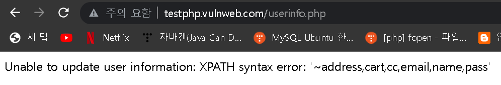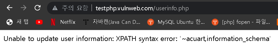 | ' or extractvalue(0x0a,concat(0x0a, database(), 0x0a)) or ' | Unable to update user information: XPATH syntax error: ' acuart ' |