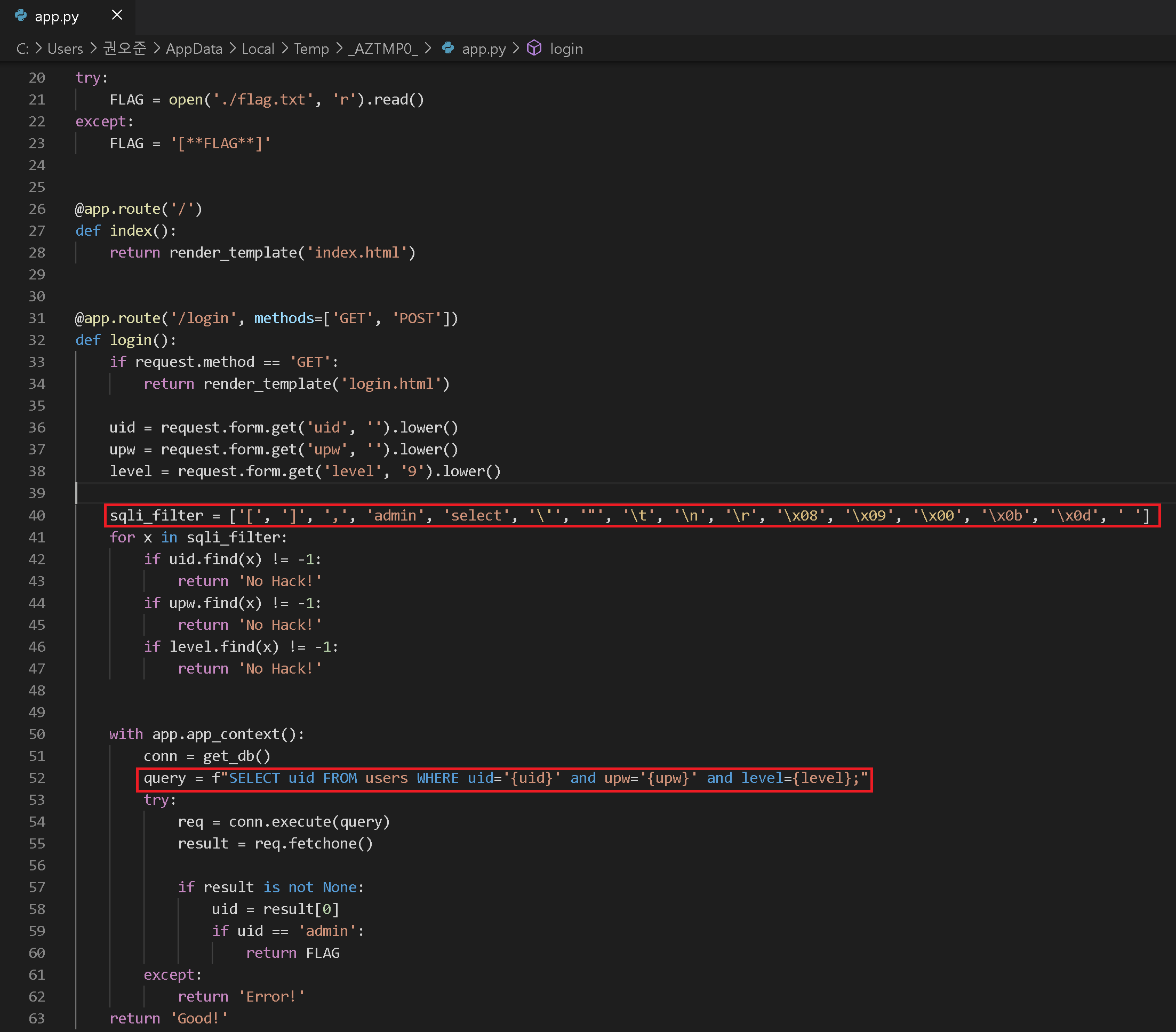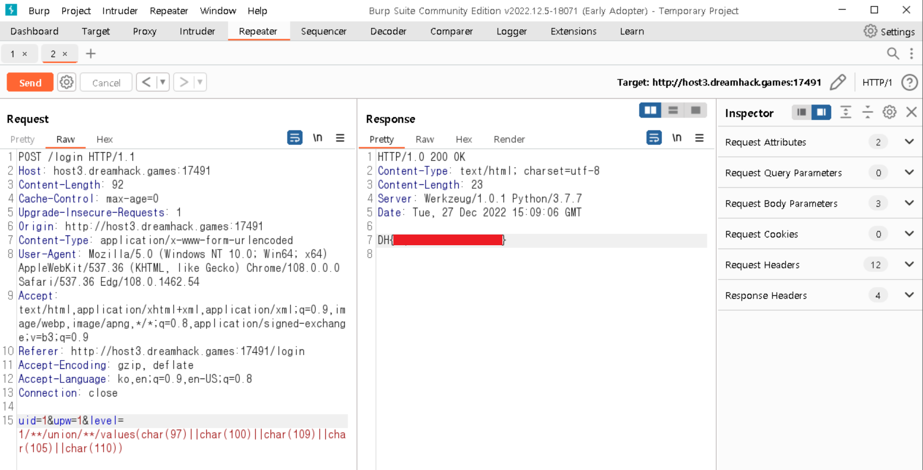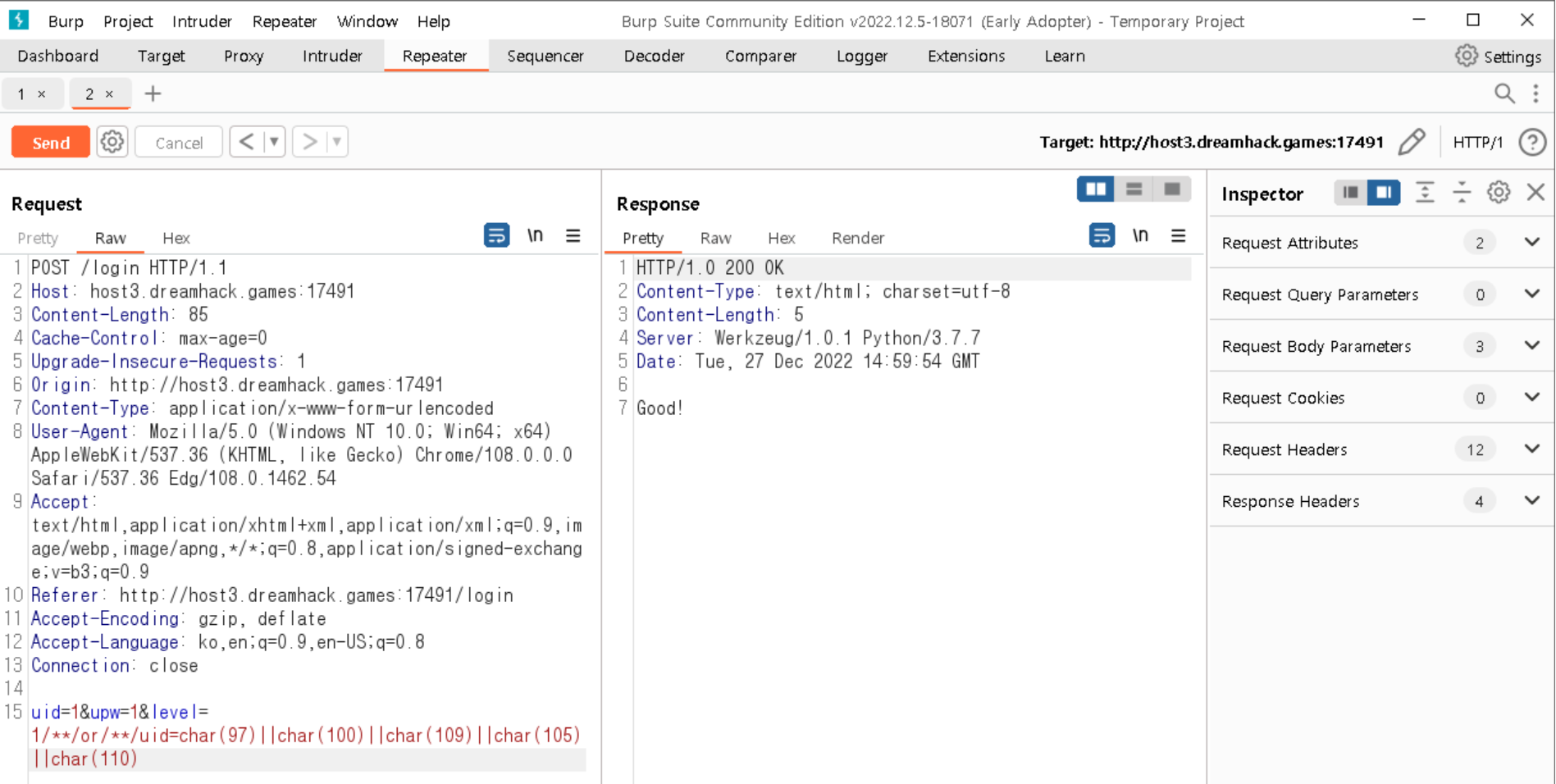 | 시도한 쿼리 | SELECT uid FROM users WHERE uid='char(97)||char(100)||char(109)||char(105)||char(110)||char(39)--' and upw='{upw}' and level={level}; |