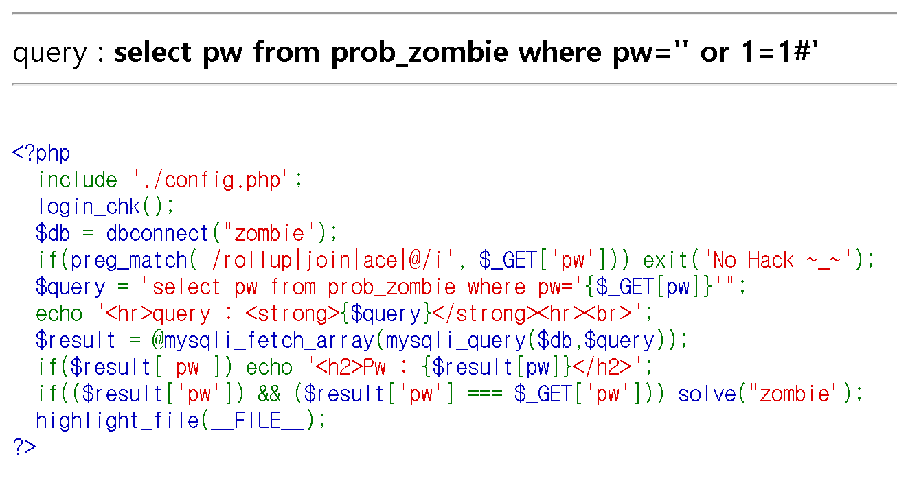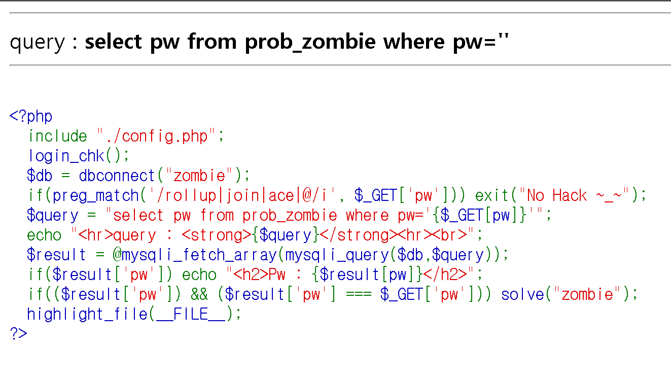 내가 입력한 쿼리 $_GET['pw] 가 DB에 위치한 pw 컬럼 값하고 동일해야된다.