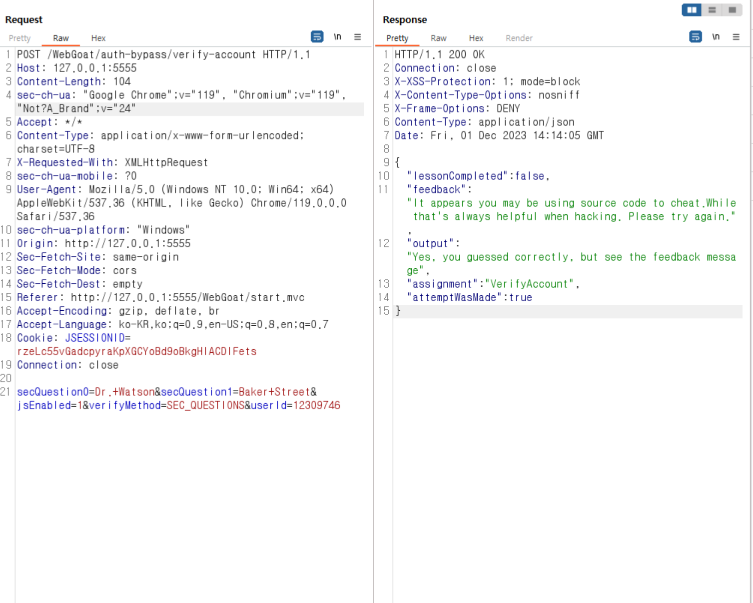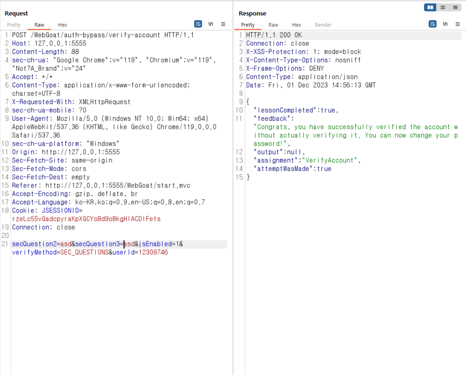 secQuestion0와 secQuestion1 파라미터를 secQuestion2와 secQuestion3로 변경하니까 성공적으로 인증 우회한것을 확인할 수 있습니다.