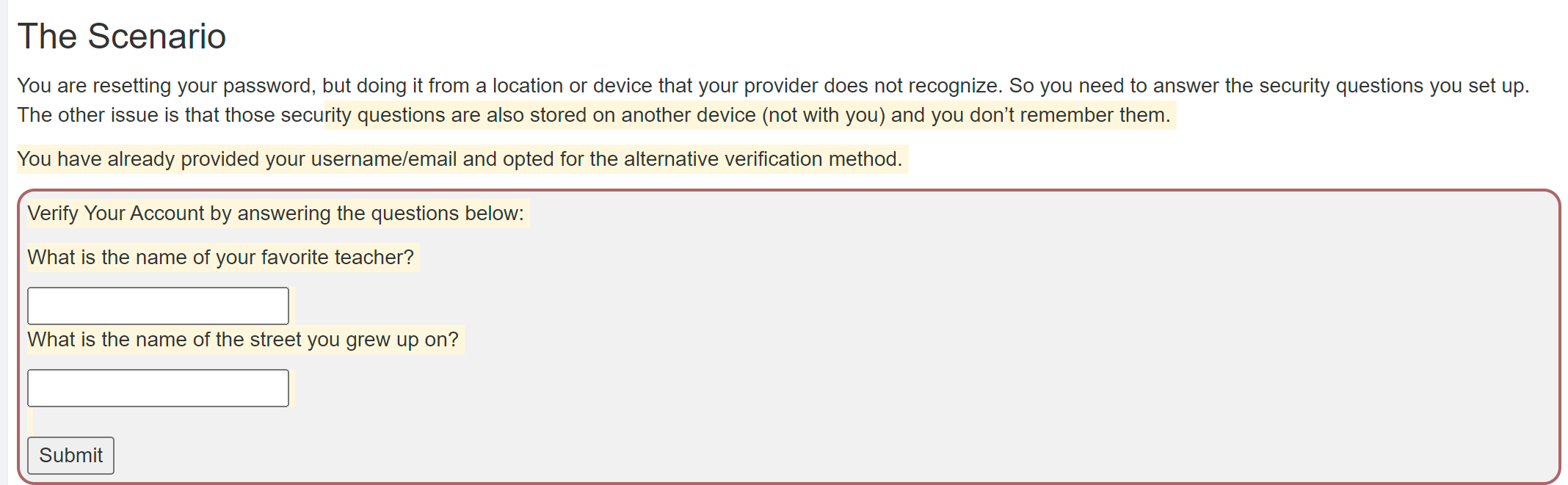 패스워드 재설정을 하기 위해 "좋아하는 선생님"과 "살아온 거리 이름" 두 가지 질문에 대답을 해야합니다.