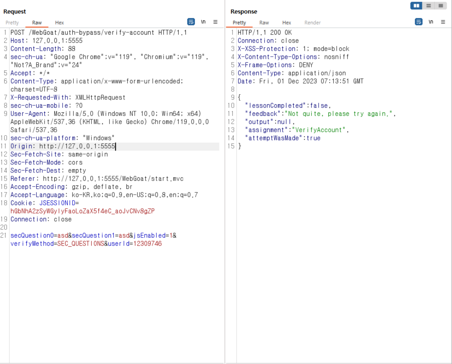 secQuestion0와 secQuestion1 파라미터를 secQuestion2와 secQuestion3로 변경하니까 성공적으로 인증 우회한것을 확인할 수 있습니다.