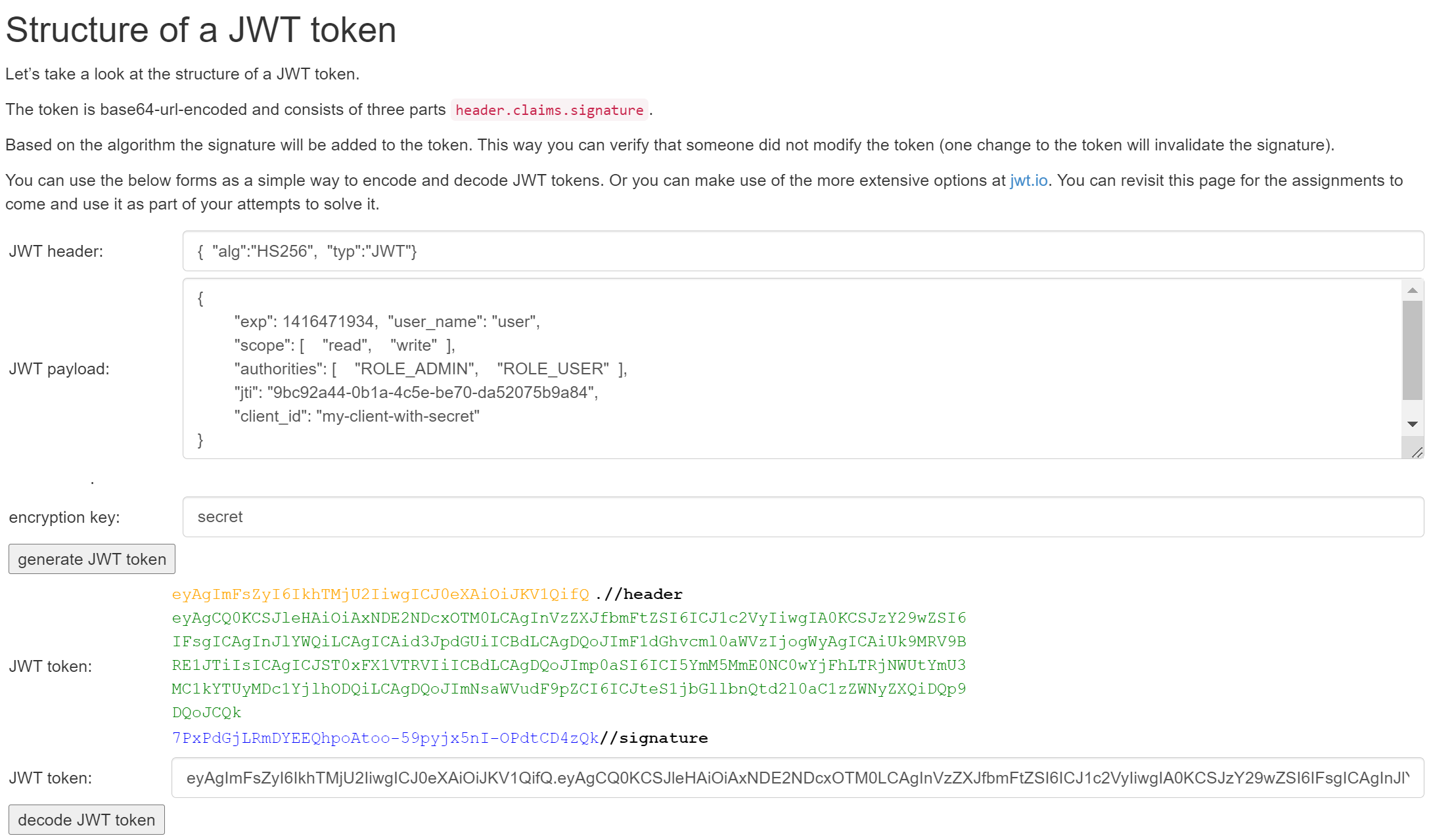 | Payload | 토큰에 저장될 클레임 정보 포함( eyJpYXQiOjE3MDIzNjgzMTAsImFkbWluIjoiZmFsc2UiLCJ1c2VyIjoiVG9tIn0 ) |