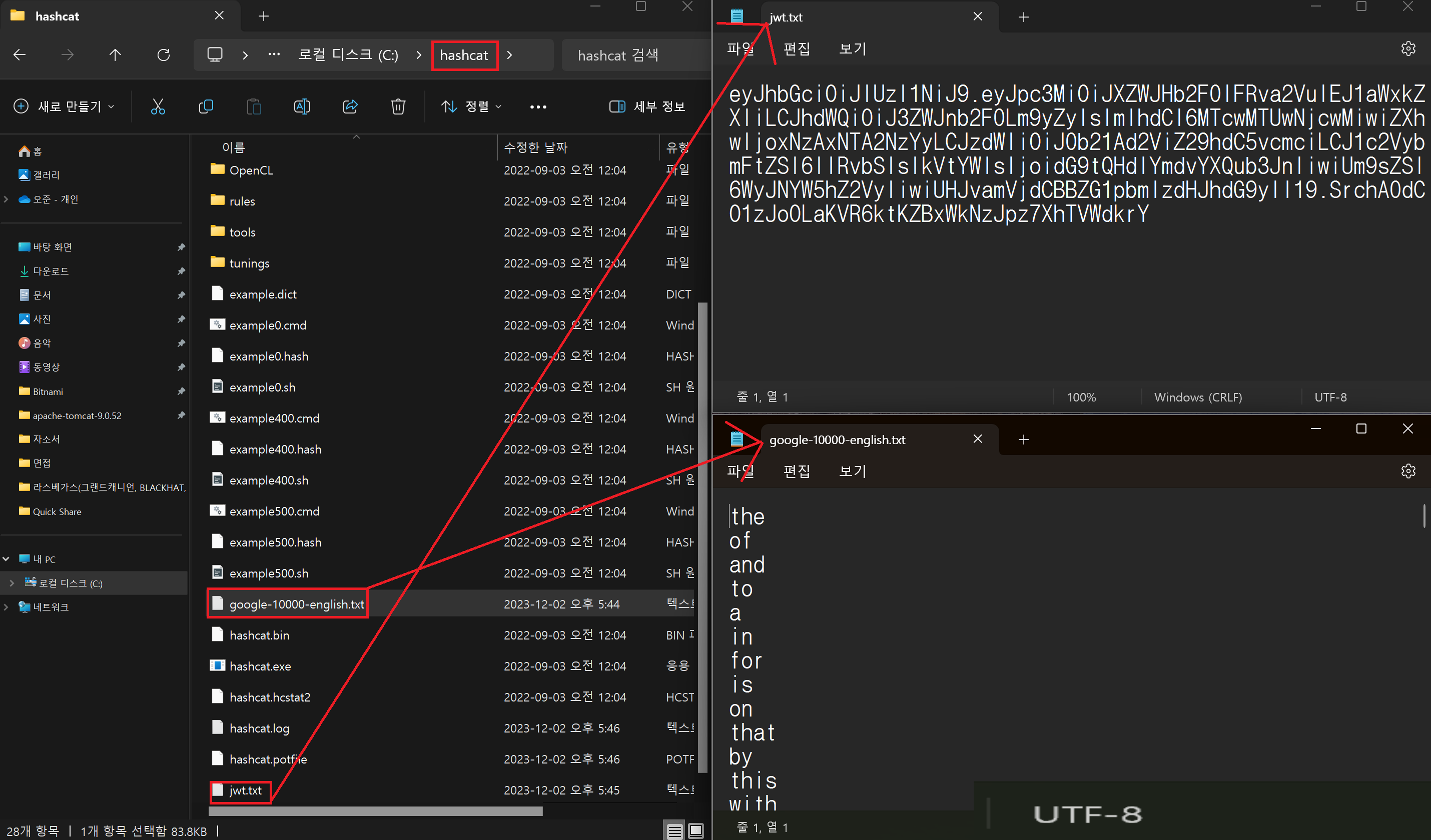 'jwt.txt' 토큰값과 'google-10000-english.txt' 사전 대입 공격에 사용할 파일을 생성해줍니다.