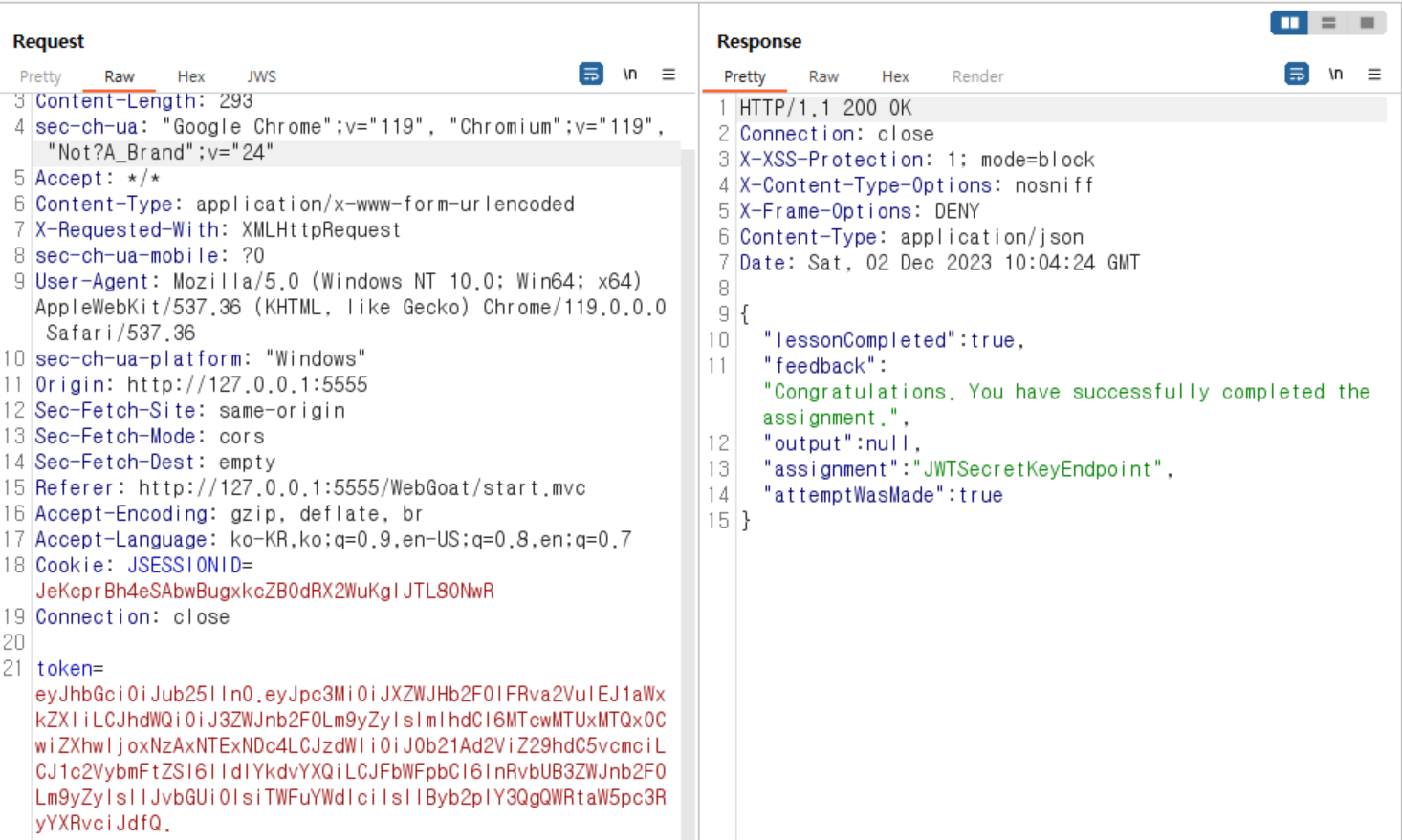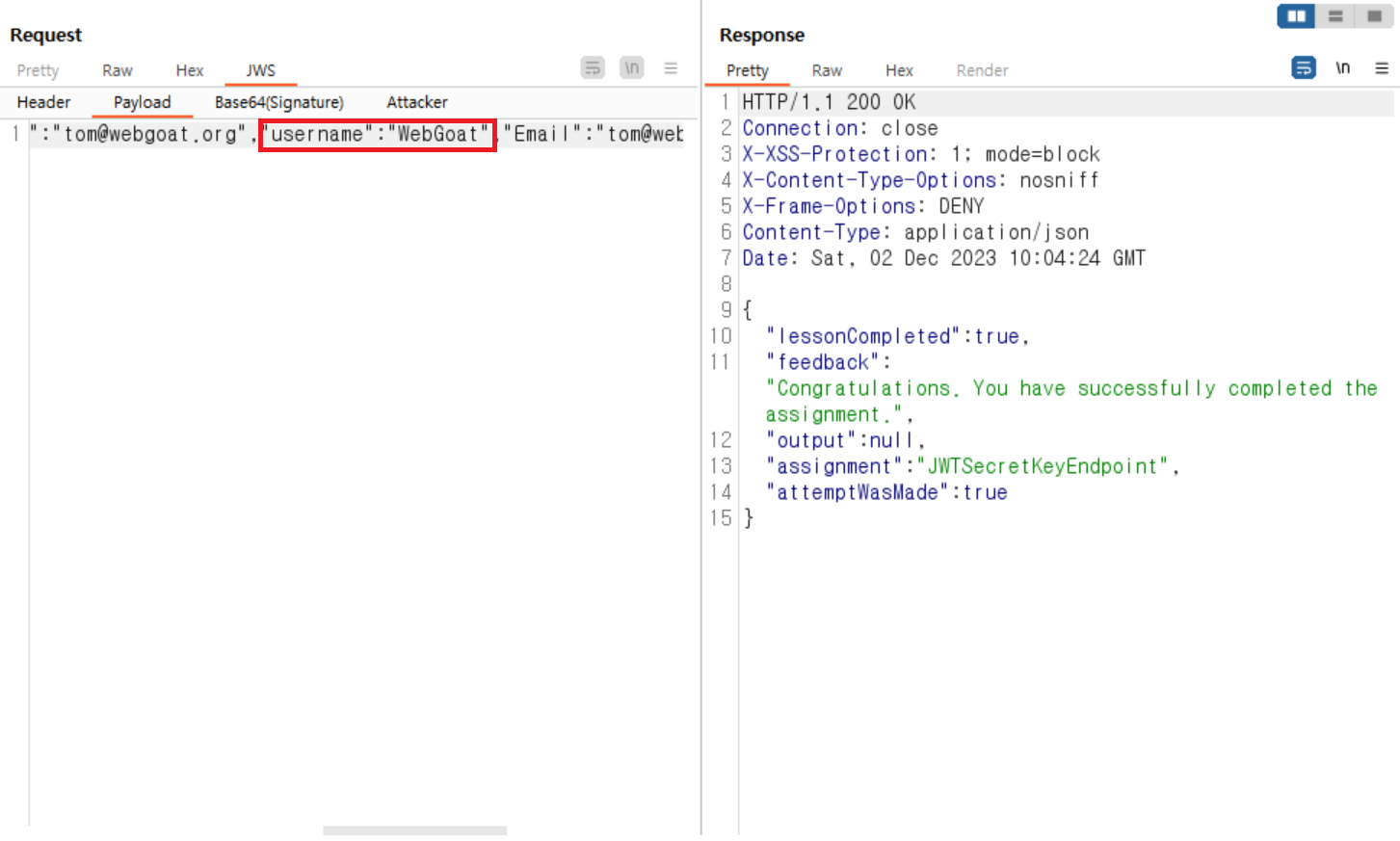해당 문제는 [Payload]의 'username' 을 'WebGoat'로 변경시켜서 JWT를 제출해야합니다.
