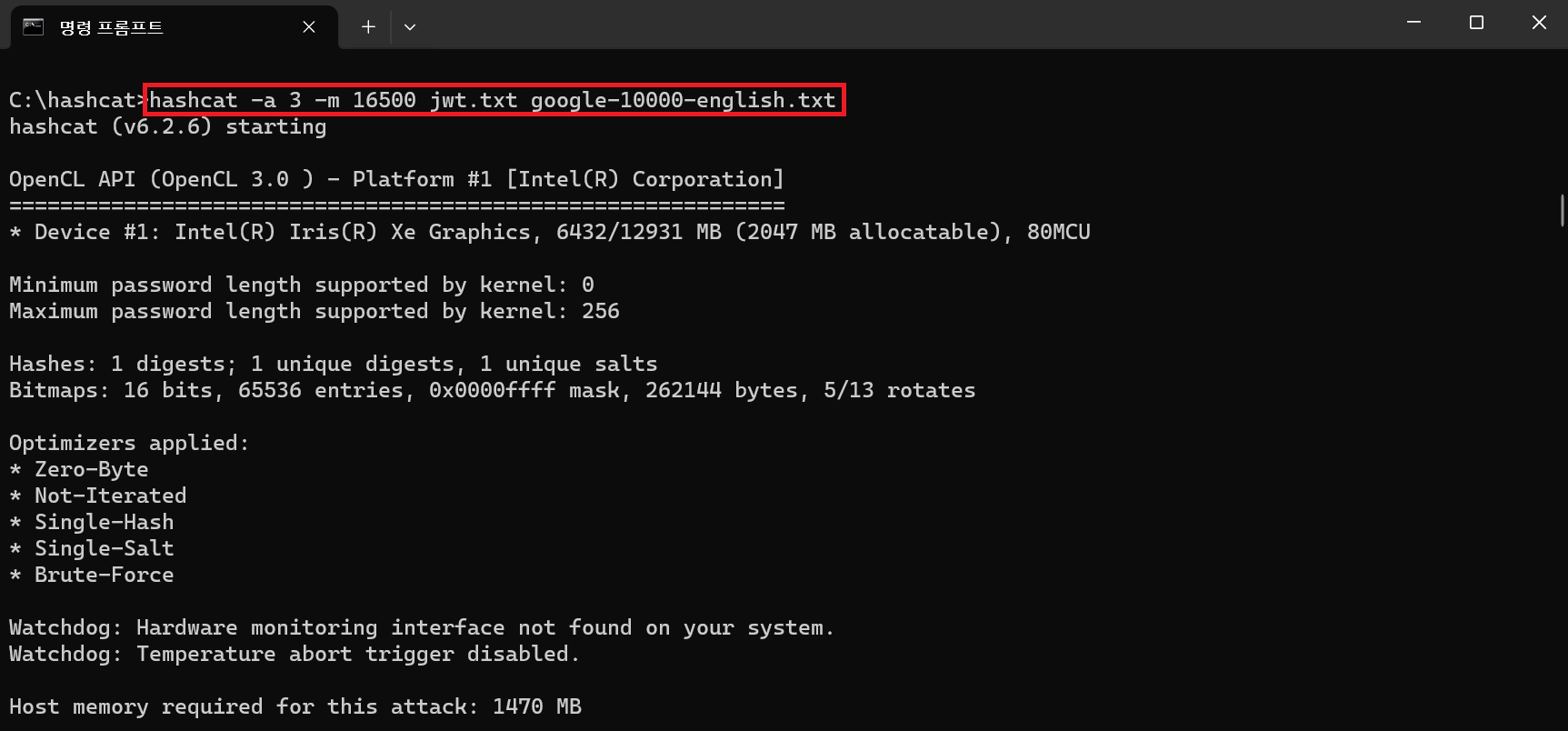 jwt.txt의 JWT 토큰에 JMT 해시 모드로 googole-10000-english.txt 사전 대입 공격을 실행시킵니다.
