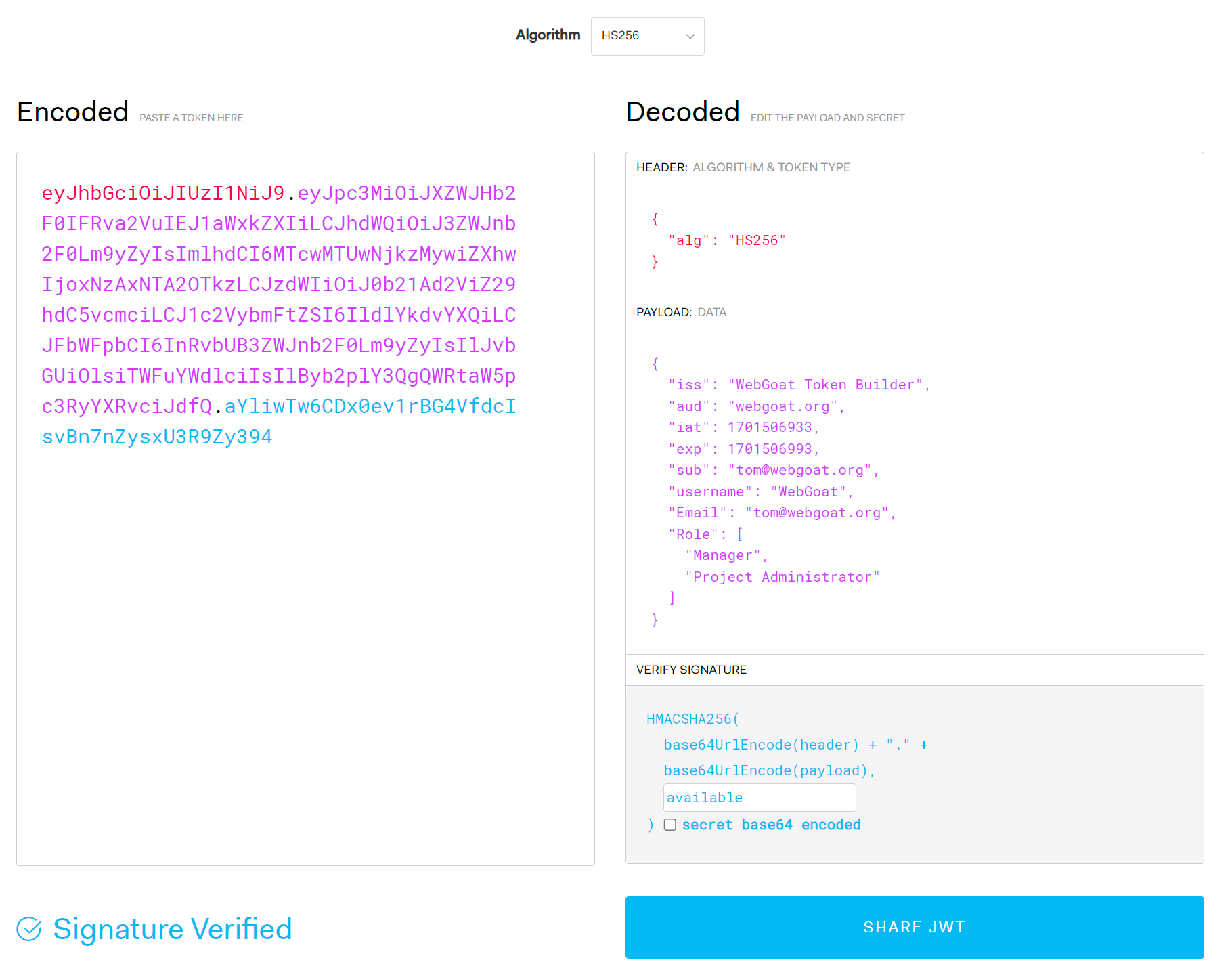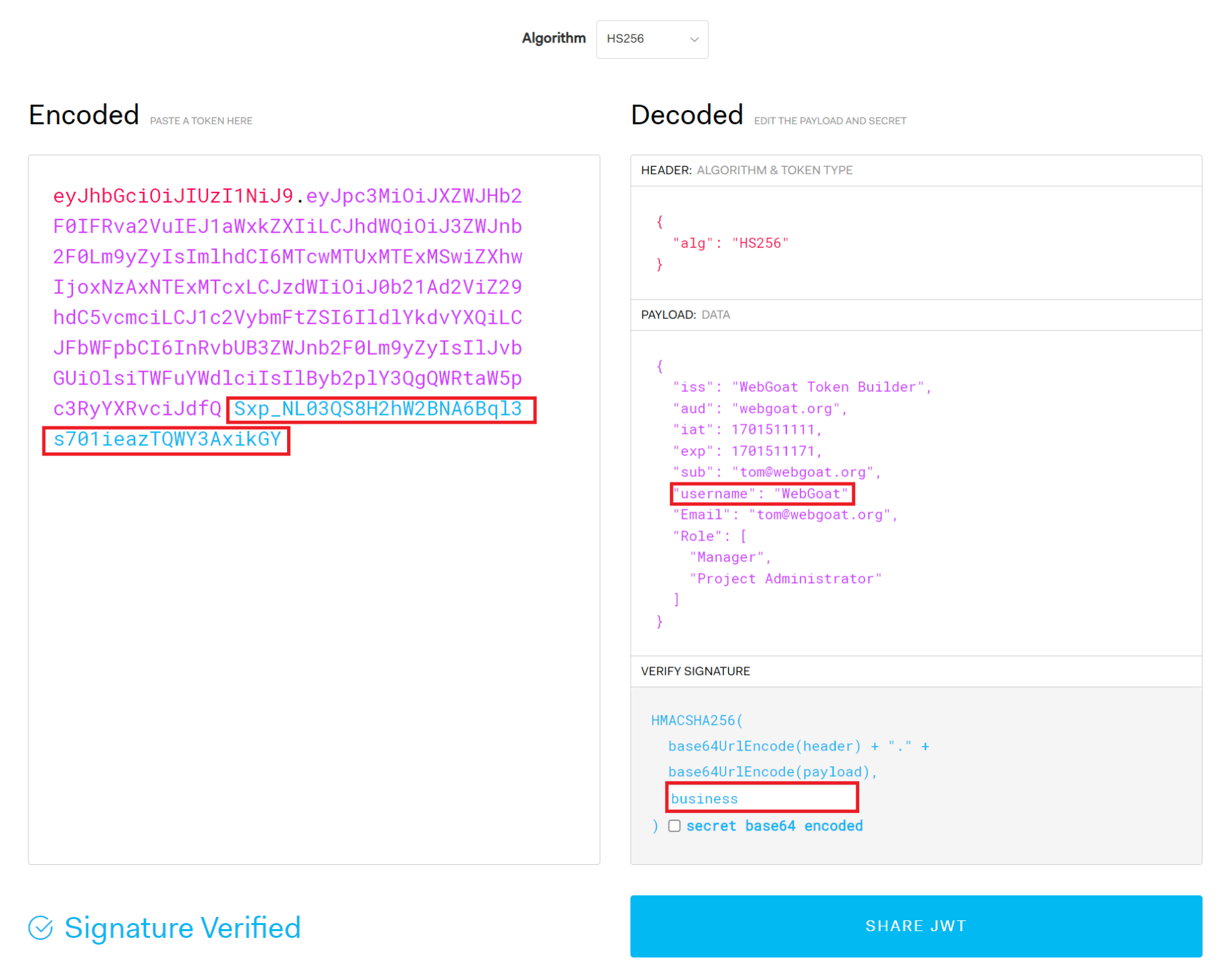 해당 문제는 [Payload]의 'username' 을 'WebGoat'로 변경시켜서 JWT를 제출해야합니다.