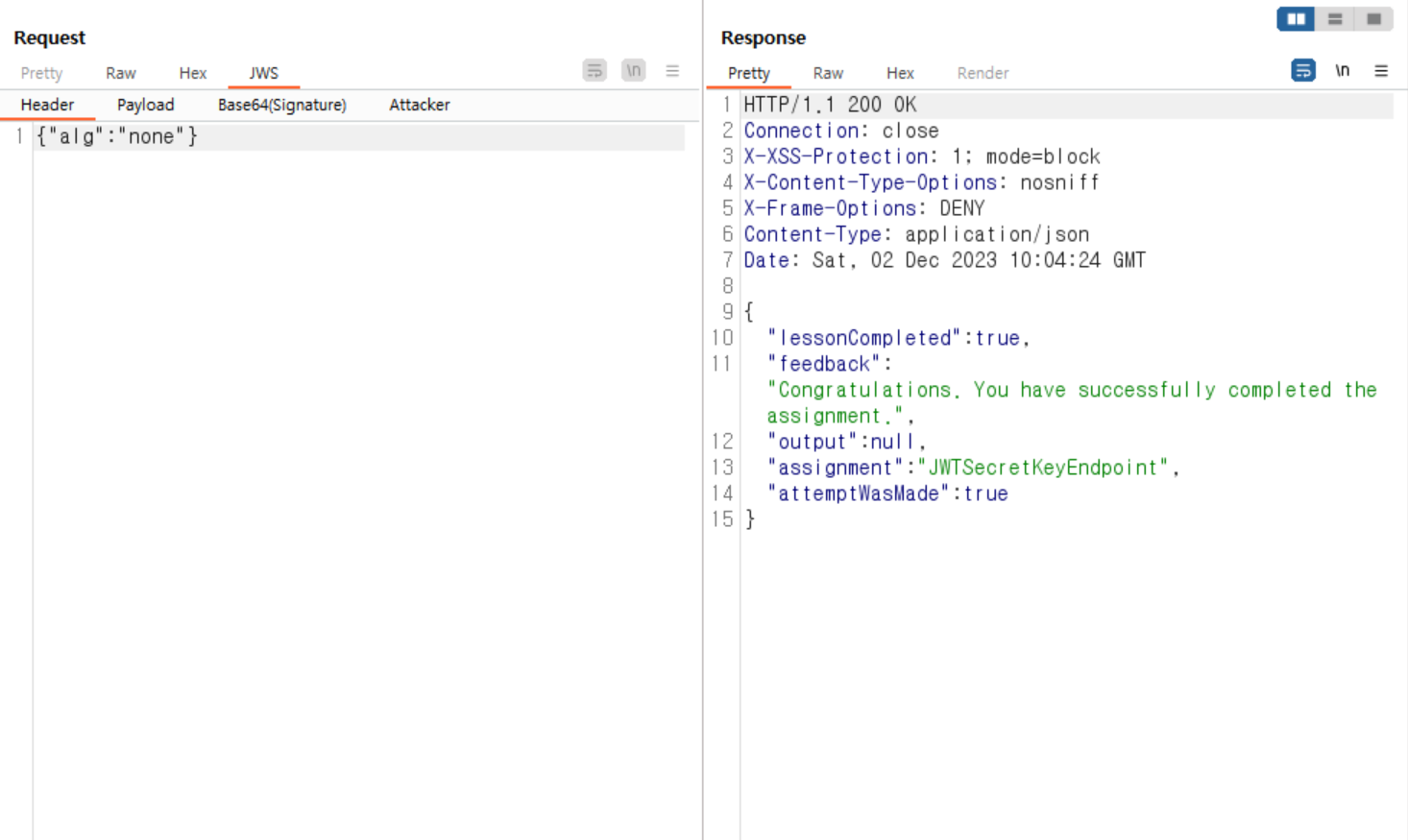 알고리즘을 'none'에 대한 취약점 조치가 되어있지 않아서