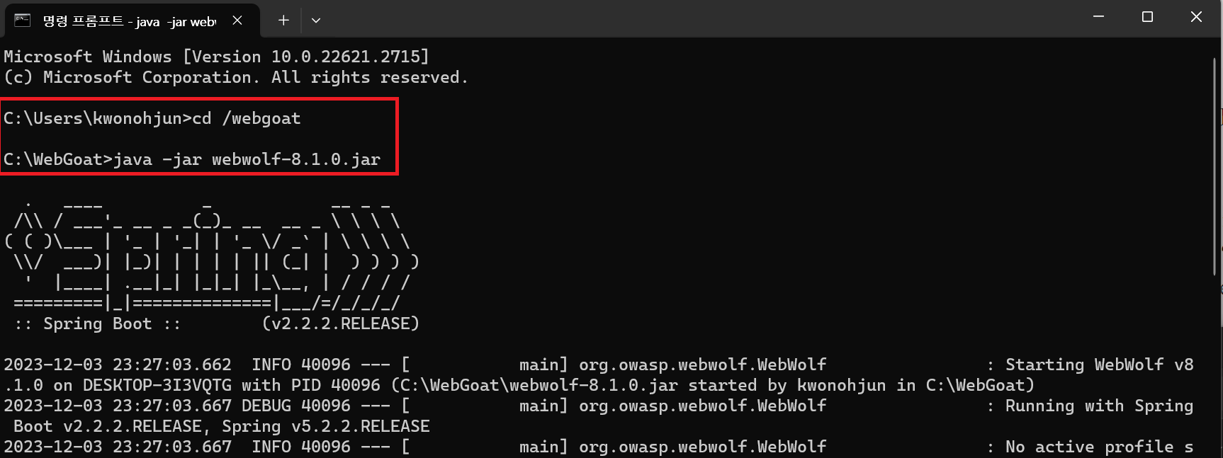 java -jar webwolf-8.1.0.jar 파일 실행시켜줍니다.