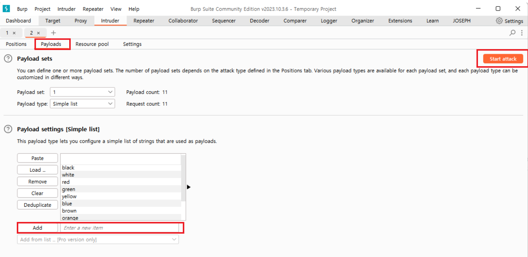 상단의 Payloads 클릭하고 사전 대입 공격할 색상의 리스트를 Add 해줍니다.