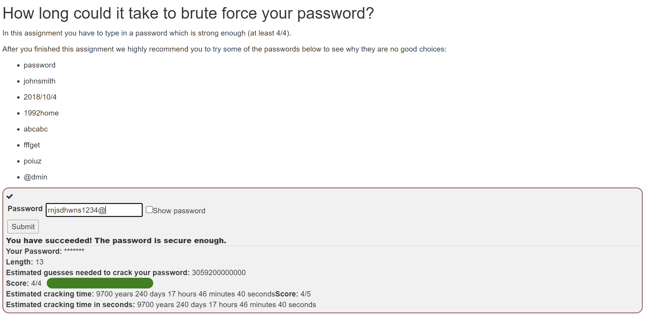 이 과제에서는 충분히 강력한(최소 4/4) 비밀번호를 입력해야 합니다.이 과제를 마친 후에는 아래 비밀번호 중 일부를 사용해 왜 이것이 좋은 선택이 아닌지 확인하는 것이 좋습니다.
