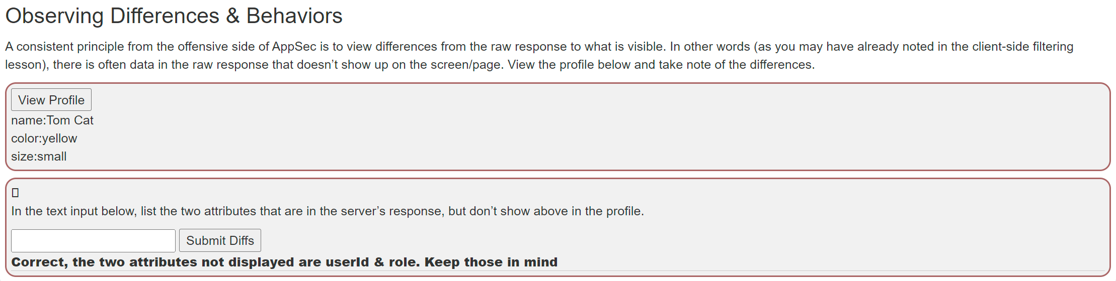 AppSec 공격 측면의 일관된 원칙은 눈에 보이는 것과 원시 응답의 차이점을 확인하는 것입니다. 즉, 클라이언트 측 필터링 강의에서 이미 언급한 것처럼 화면/페이지에 표시되지 않는 원시 응답의 데이터가 있는 경우가 많습니다. 아래 프로필을 보고 차이점을 확인하세요.
