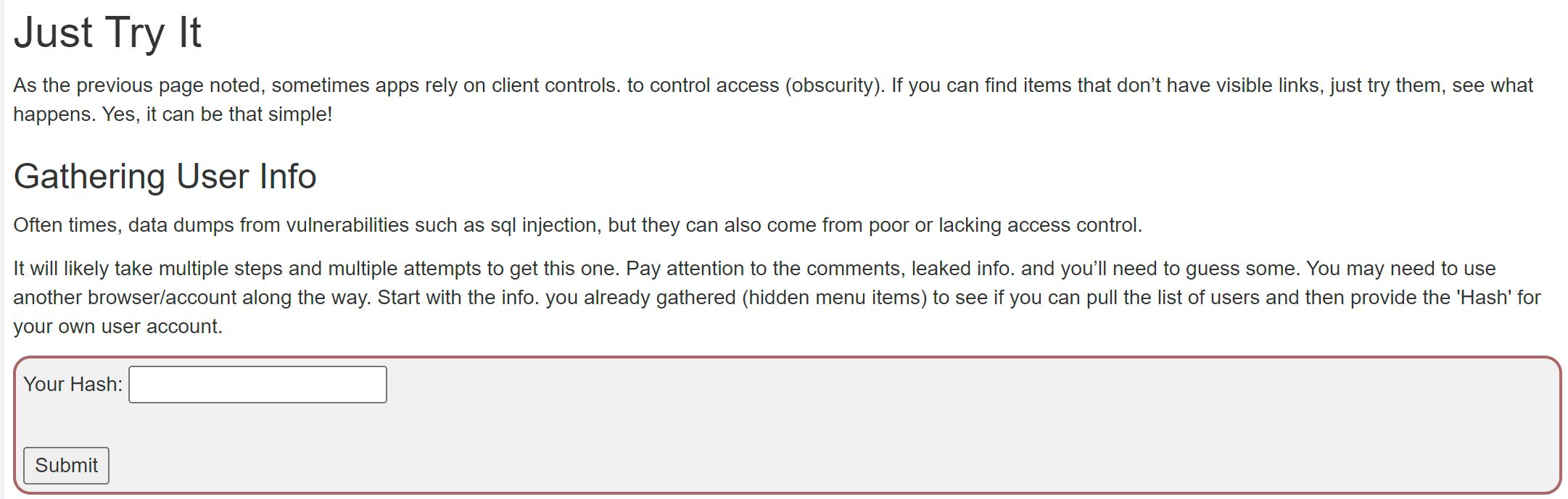 이전 페이지에서 언급했듯이 때때로 앱은 클라이언트 컨트롤에 의존합니다. 액세스를 제어합니다(모호함). 눈에 보이는 링크가 없는 항목을 찾으면 시도해 보고 무슨 일이 일어나는지 확인하세요. 예, 그렇게 간단할 수 있습니다!