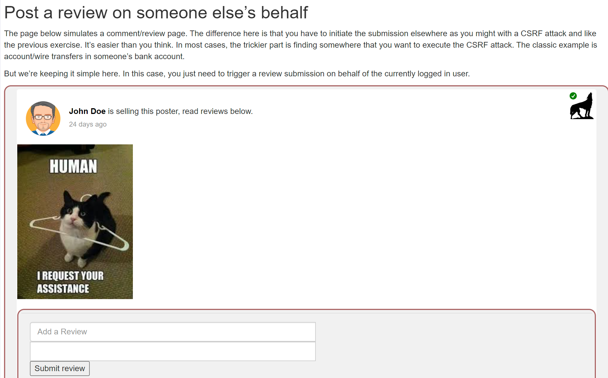 아래 페이지는 댓글/리뷰 페이지를 시뮬레이션합니다. 여기서 차이점은 CSRF 공격과 마찬가지로 이전 연습과 마찬가지로 다른 곳에서 제출을 시작해야 한다는 것입니다. 생각보다 쉽습니다. 대부분의 경우 더 까다로운 부분은 CSRF 공격을 실행하려는 위치를 찾는 것입니다. 전형적인 예는 누군가의 은행 계좌로의 계좌/전신 송금입니다.