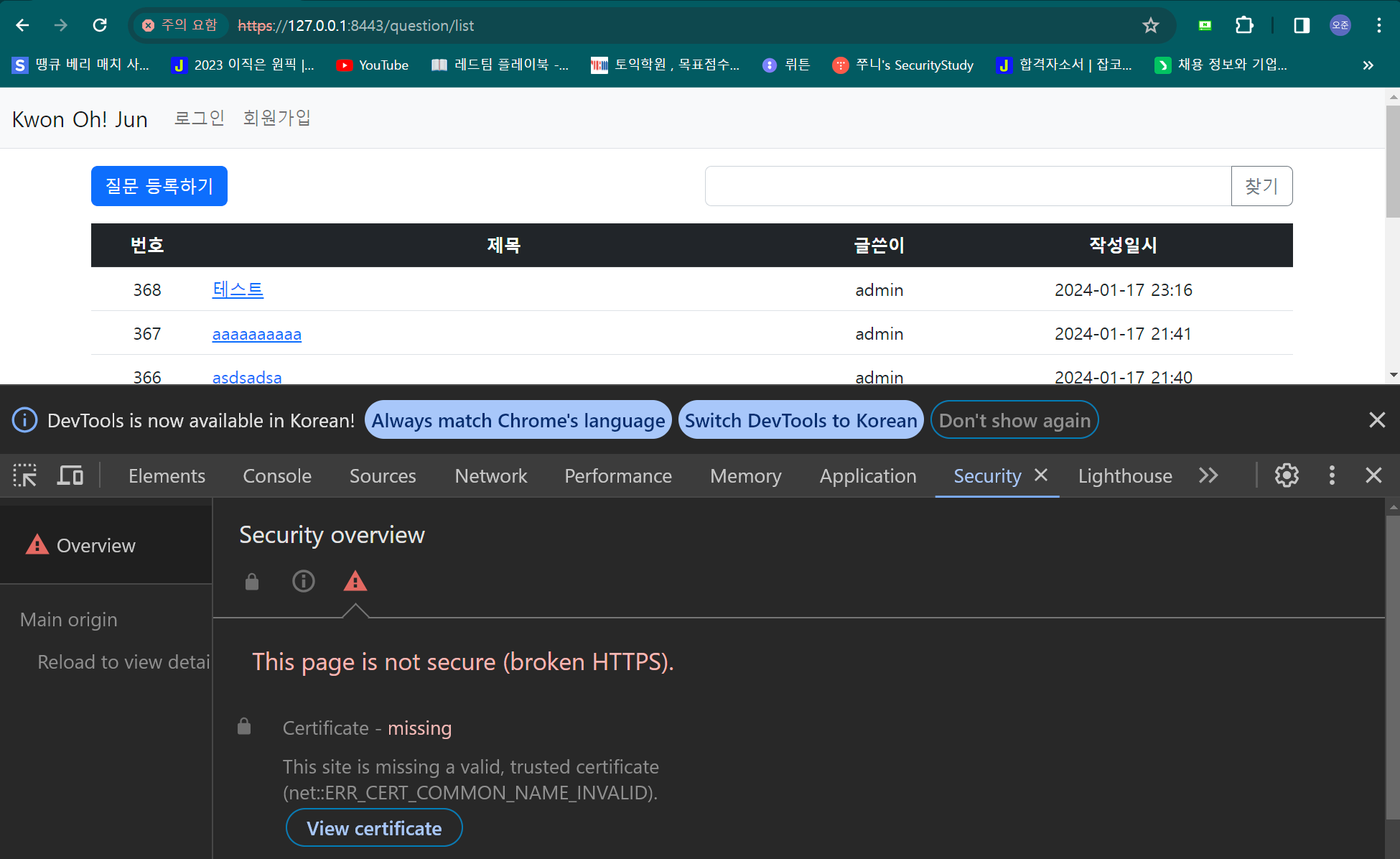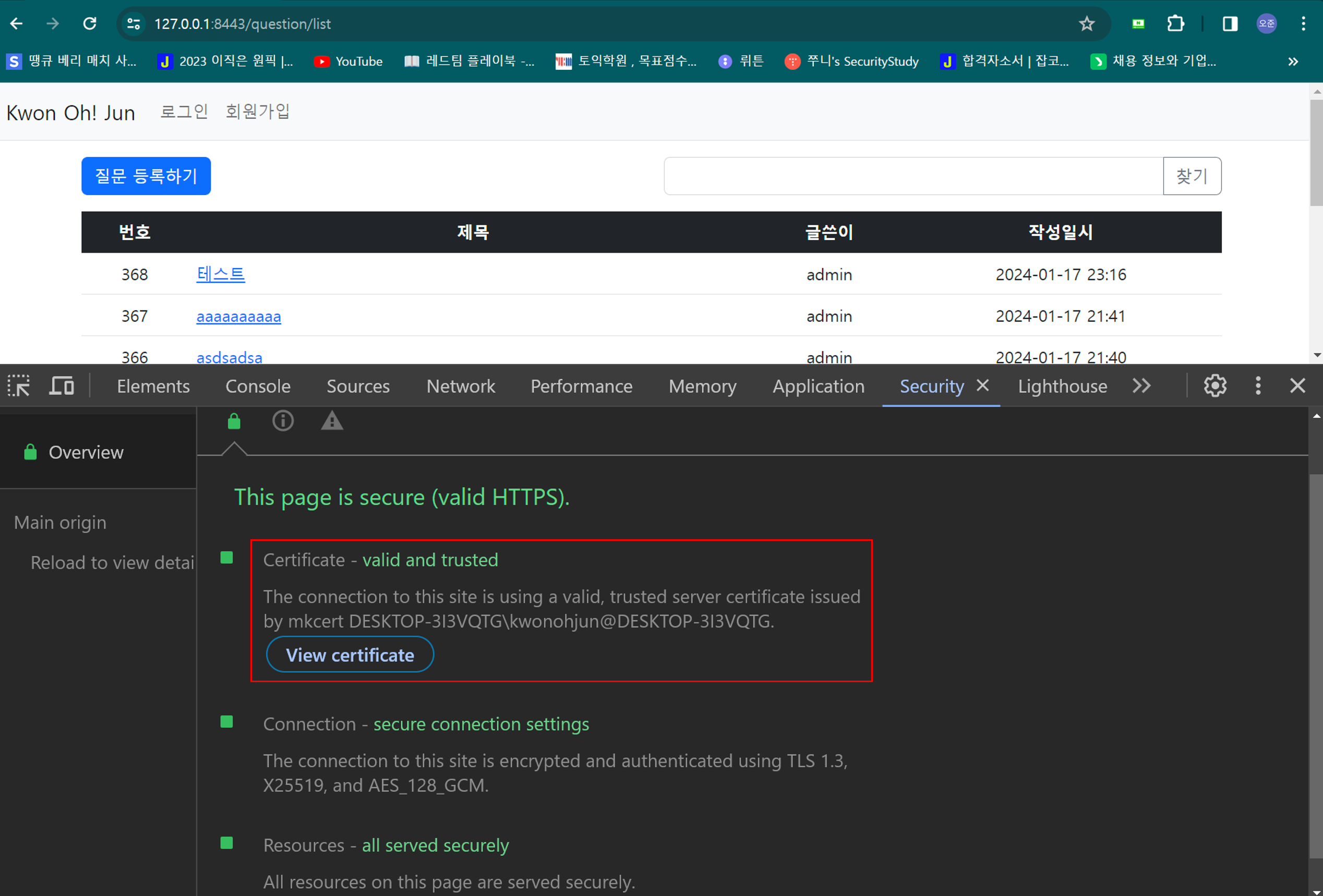 로컬 페이지에 HTTPS가 적용된것을 확인할 수 있다.