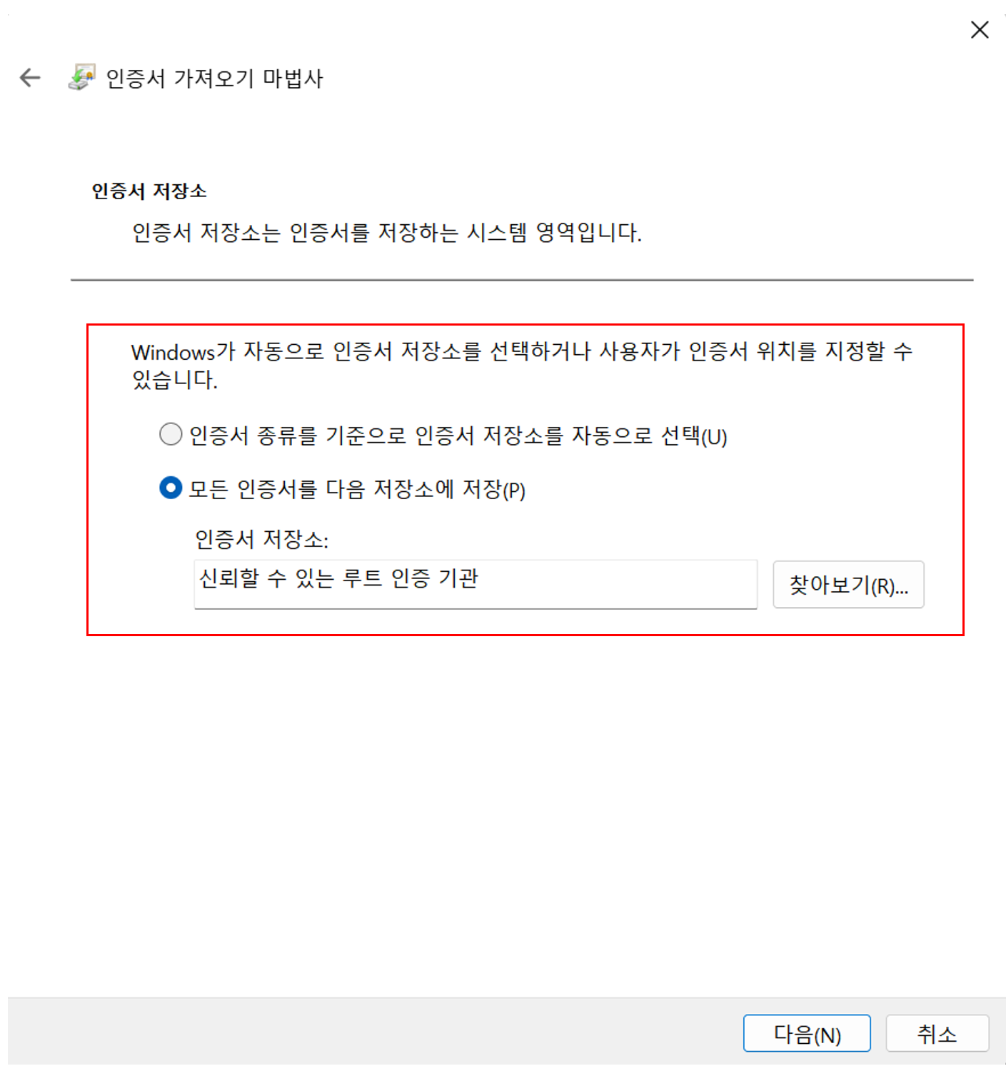 "모든 인증서를 다음 저장소에 저장" 체크하고 찾아보기에서 "신뢰할 수 있는 루트 인증 기관" 확인합니다.
