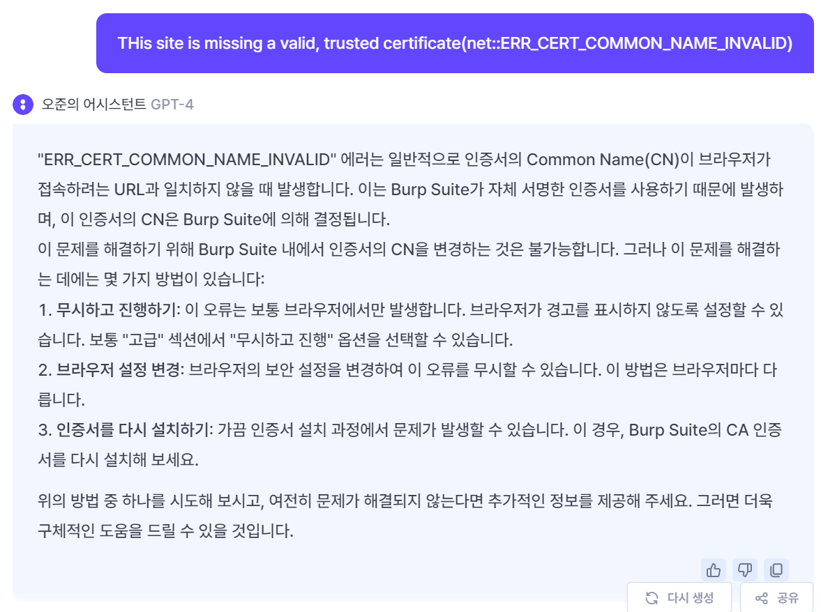 Burp Suite의 CN을 변경하는것이 불가능해서 GPT 형님한테도 물어봤는데 "무시하고 진행하기", "브라우저 설정 변경"은 오류 무시하는거라 Burp Suite에서는 적용안되고, "인증서를 다시 설치하기"는 다시 해봤는데 역시나 안됩니다.