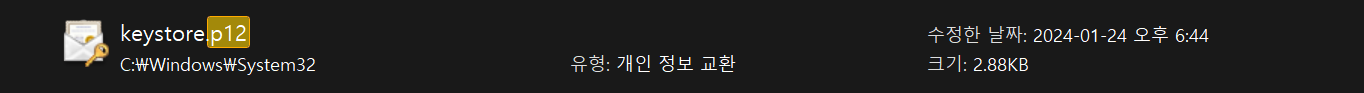 C:\Windows\System32에 위치한 keystore.p12 저장소 파일을 \src\main\resources 디렉토리로 이동시켜줘야 합니다.