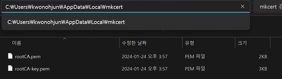 '127.0.0.1.pem' (공개 키)와 '127.0.0.1-key.pem' (비공개 키) 두 개의 파일을 생성합니다.