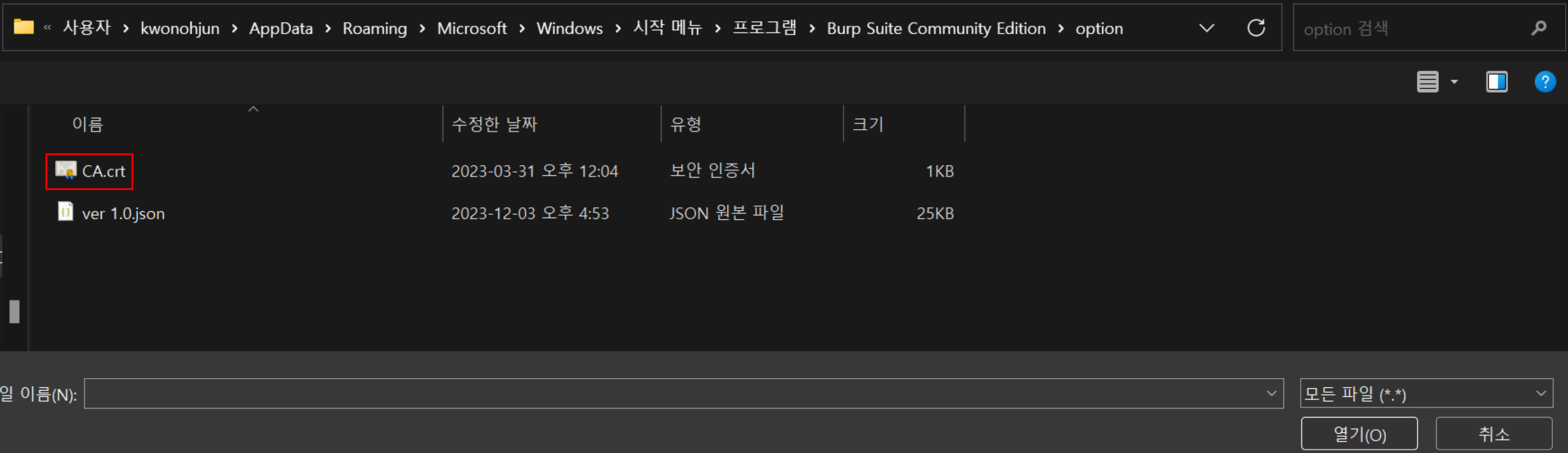 위에서 인증서 가져온거랑 똑같이 burp suite CA 인증서도 적용시켜봤는데 똑같습니다.