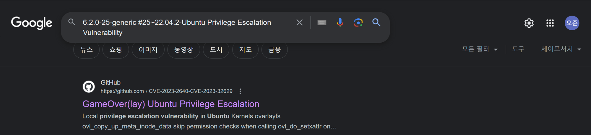 해당 시스템의 권한 상승 취약점을 확인하기 위해 구글링 해봄. 'CVE-2023-2640-CVE-2023-32629'에서 ubuntu 커널의 취약점으로 인한 권한 상승을 할 수 있는 취약점을 찾을 수 있었음.