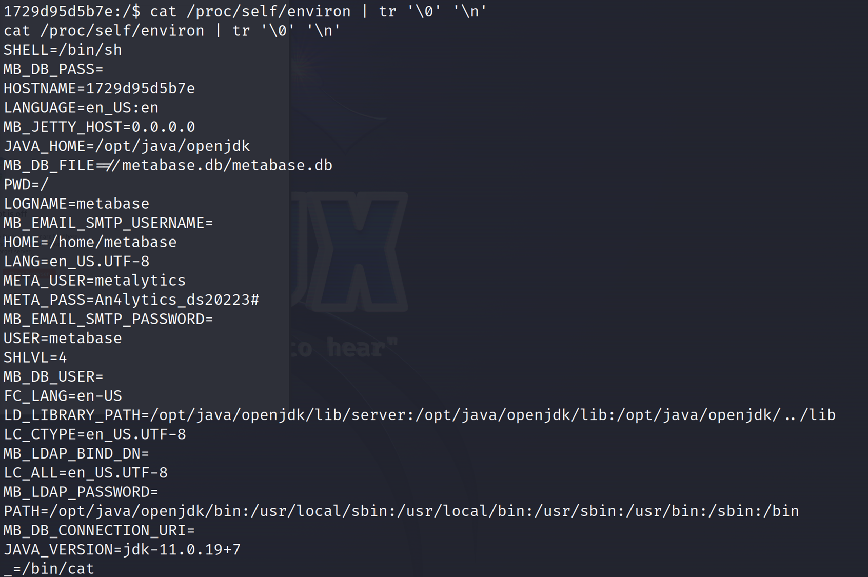 /proc/self/environ 파일은 현재 실행 중인 프로세스의 환경 변수를 저장하고 있는 특별한 파일임. 'metabase'의 서버 계정 정보 'META_USER=metalytices', 'META_PASS=An4lytics_ds20223#'을 확인할 수 있음.