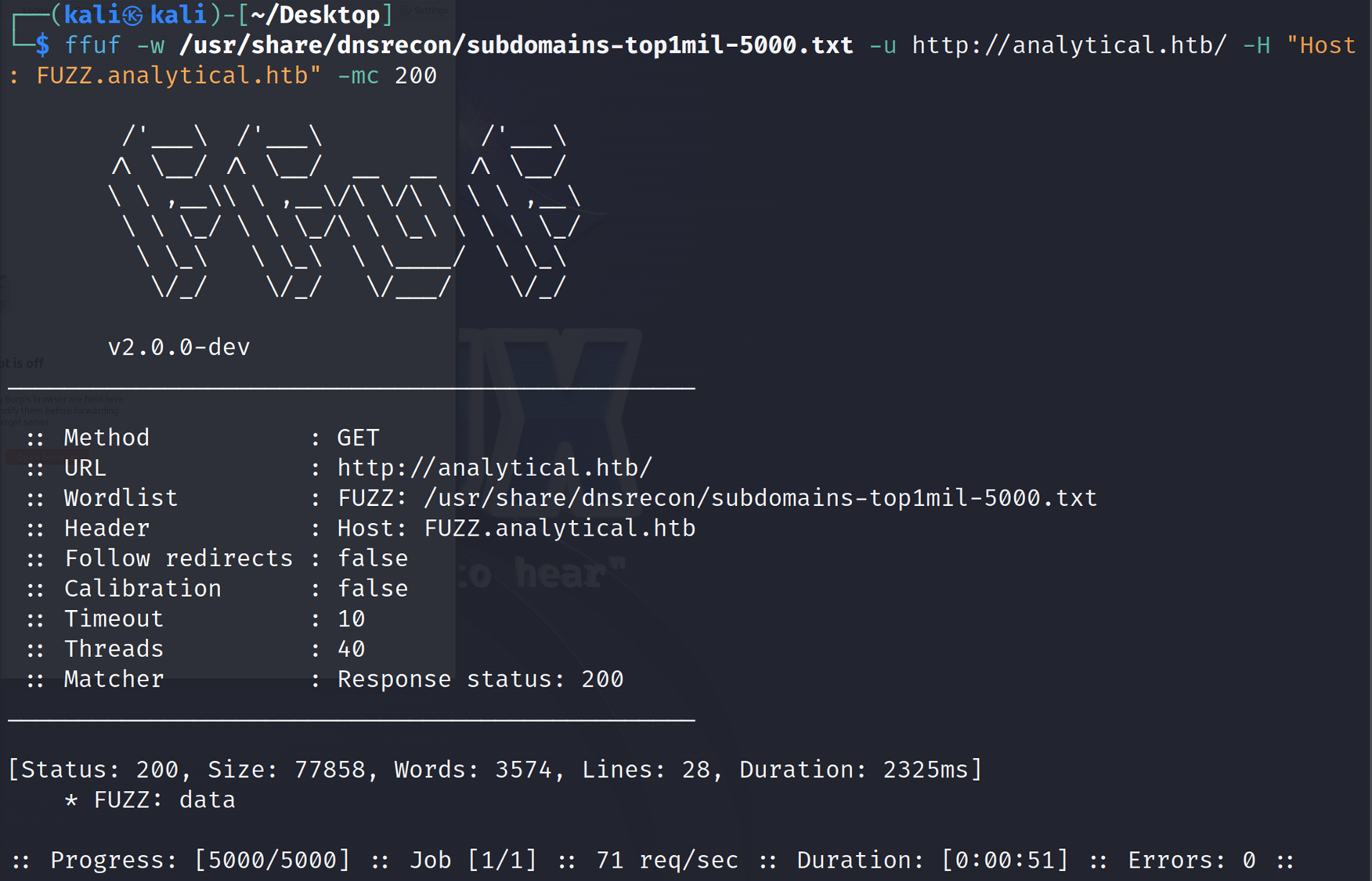 ffuf -w /usr/share/dnsrecon/subdomains-top1mil-5000.txt -u http://analytical.htb/ -H "Host: FUZZ.analytical.htb" -mc 200