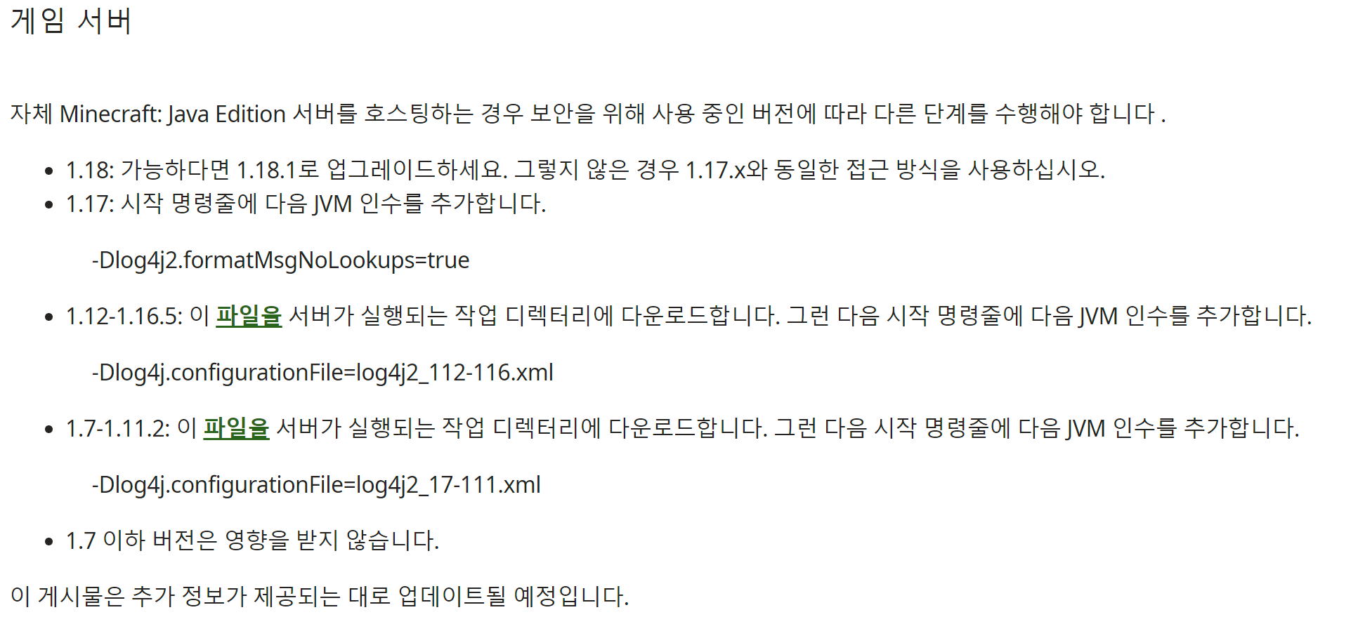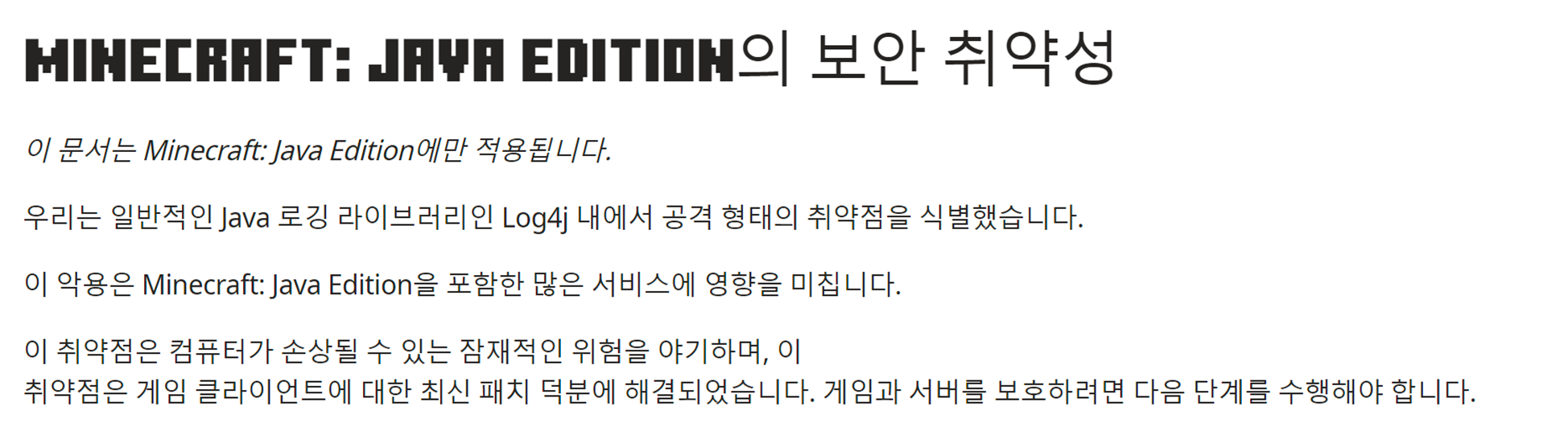 'Minecraft 1.16.5 cve' 검색하니까 마인크래프트 사이트에서 log4j 보안 취약성에 대한 공지문을 확인할 수 있었음.