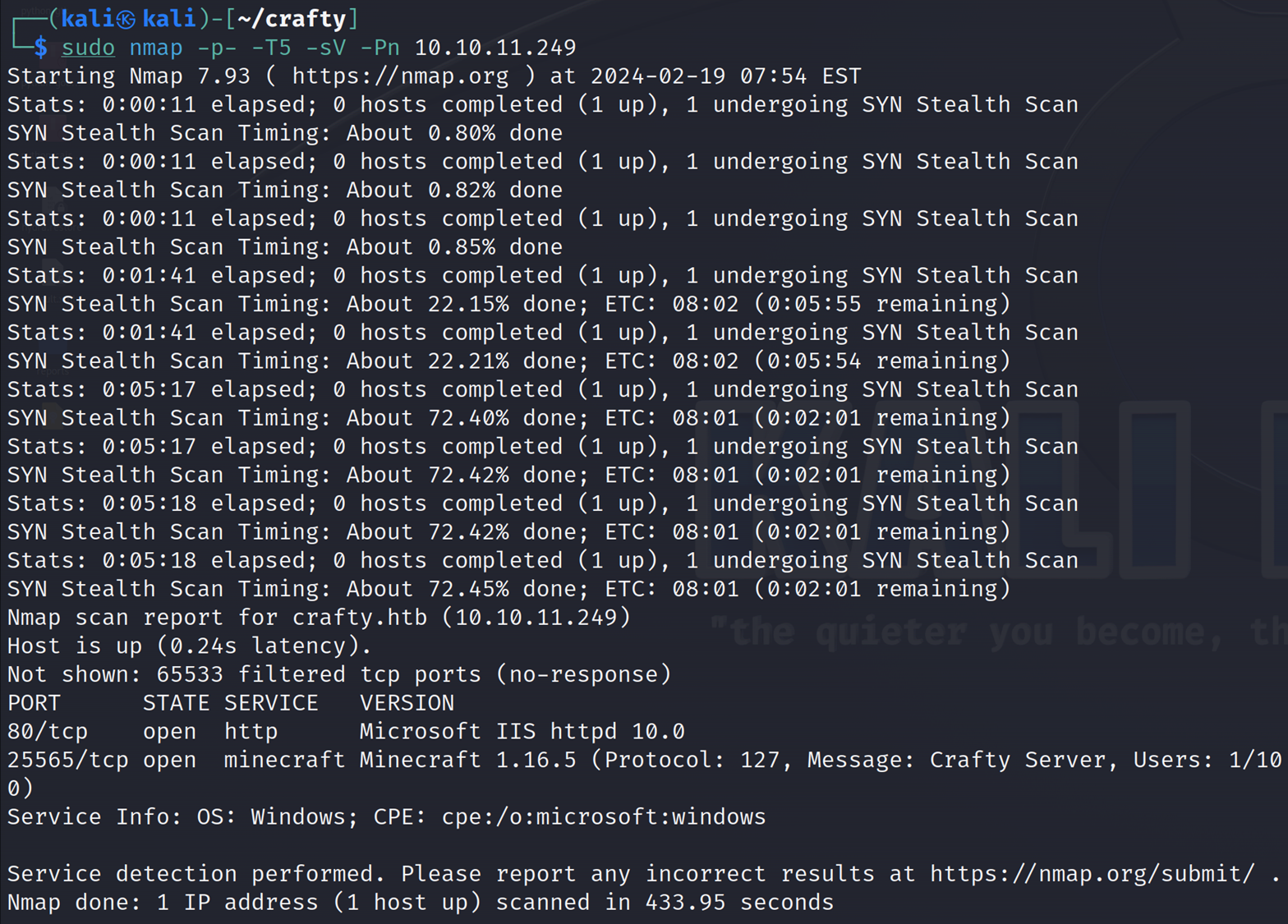 그래서 포트를 전체 스캔을 했는데 '25565' 마인크래프트 게임 관련된 포트인거 같음.