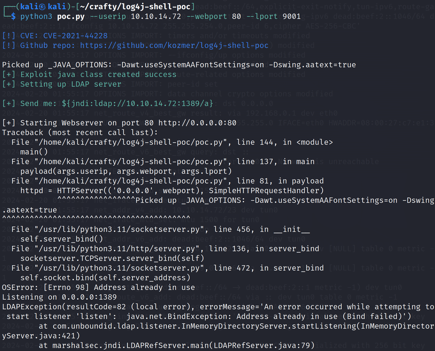 '/home/kali/crafty/log4j-shell-poc/jdk 1.8.0_20/bin/java'를 찾을 수 없다고 함.