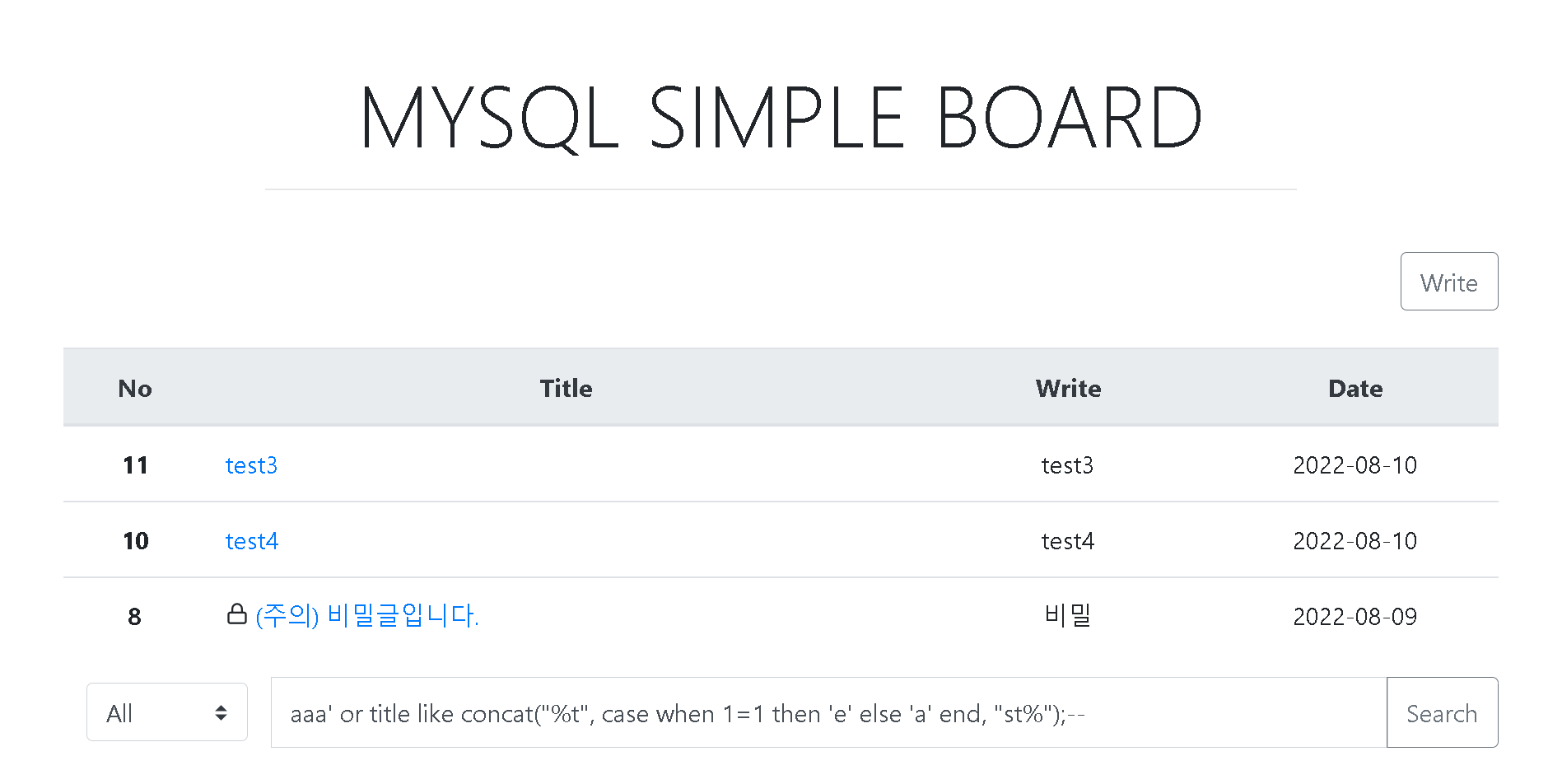 | select * from tb_board where title like '%aaa' or title like concat("%t", case when 1=1 then 'e' else 'a' end, "st%")-- %'; | mysql |