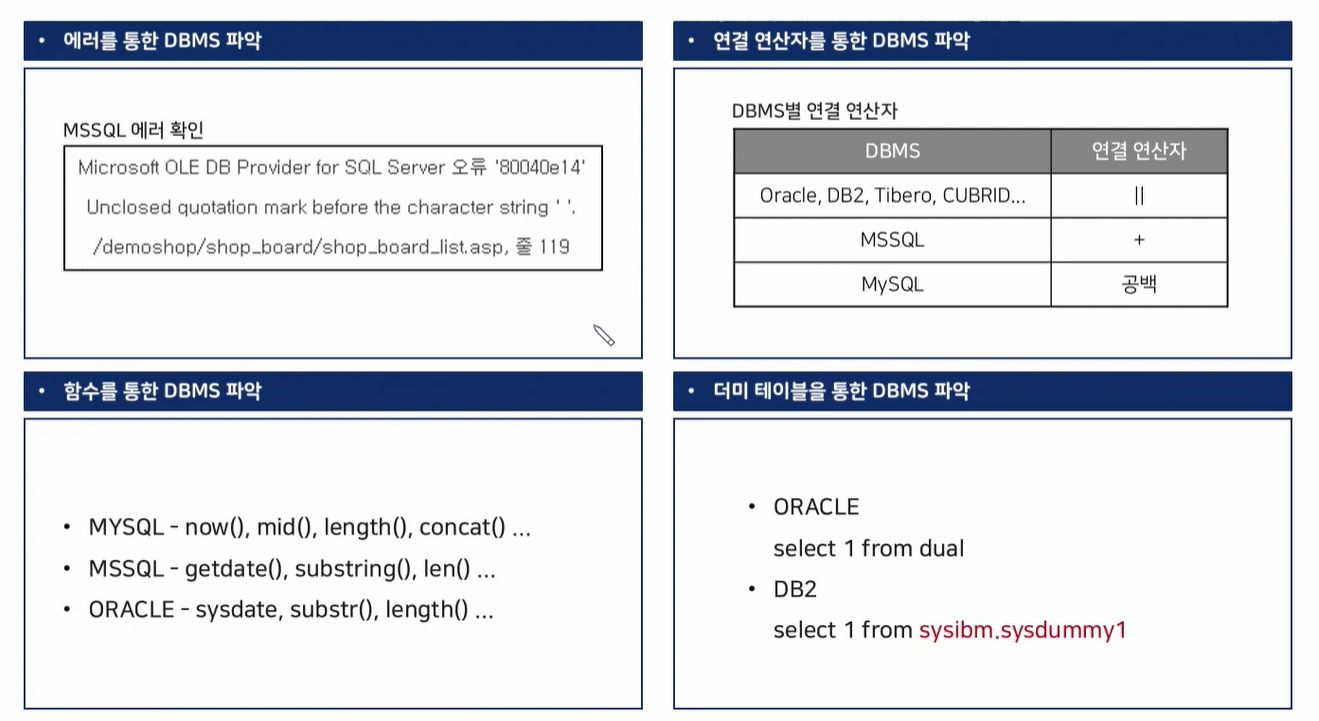 DBMS를 파악하는 방법은 위의 방법들이 있는데 실무자에 의하면 연결 연산자를 가장 많이 사용한다고 한다.