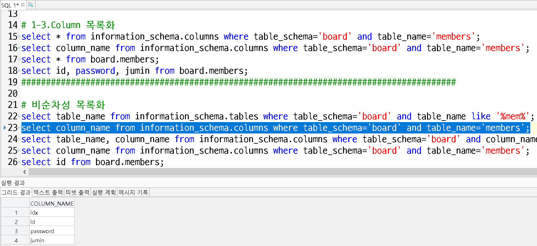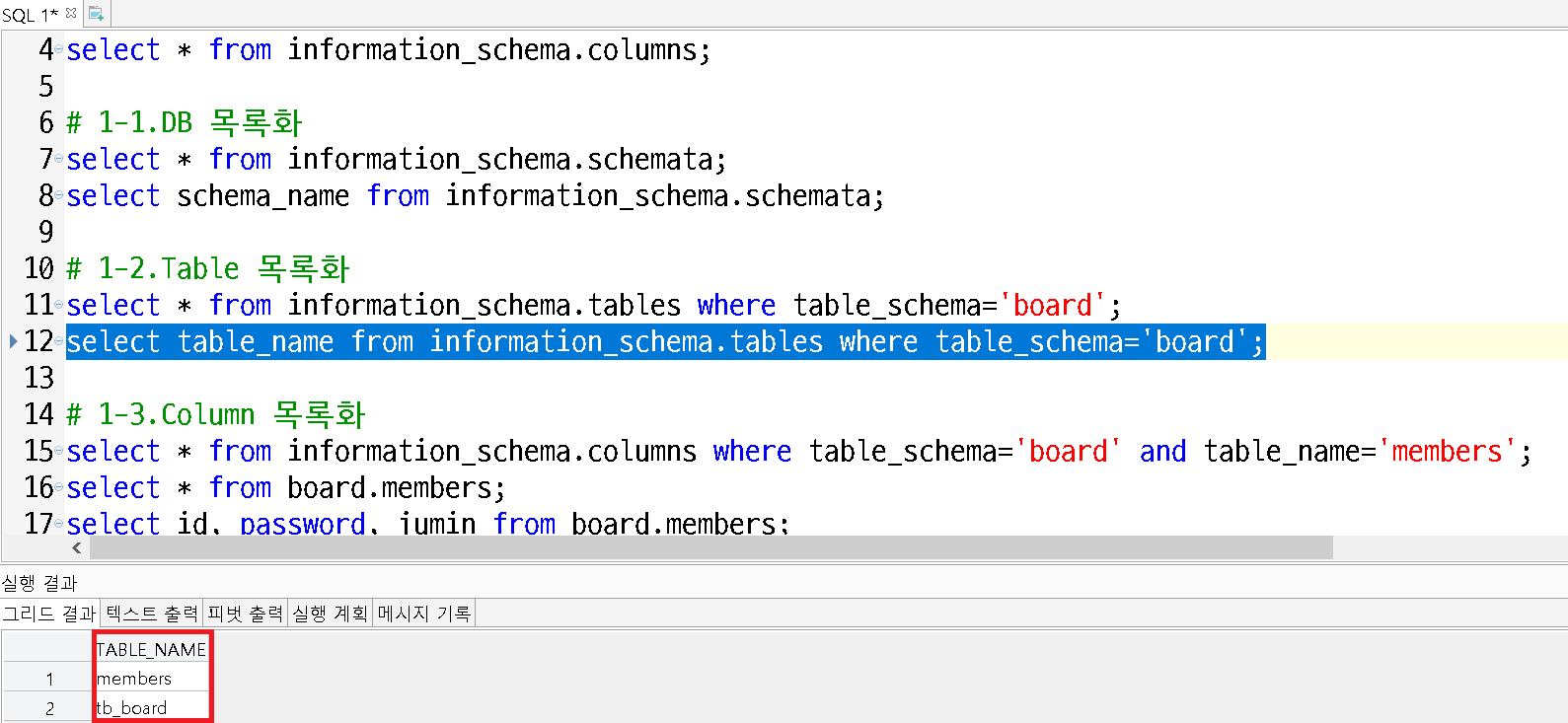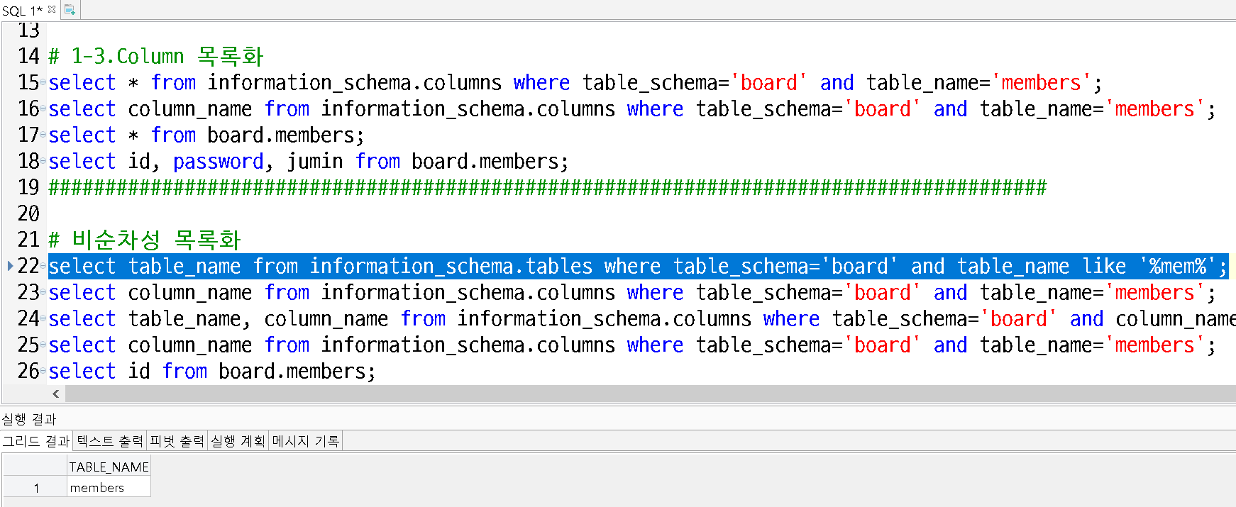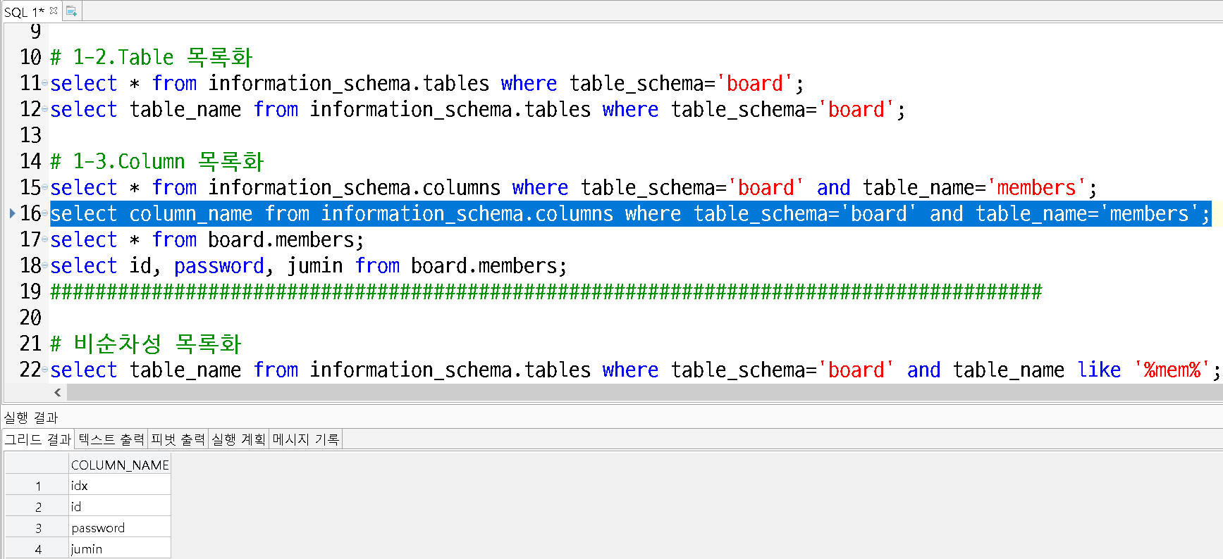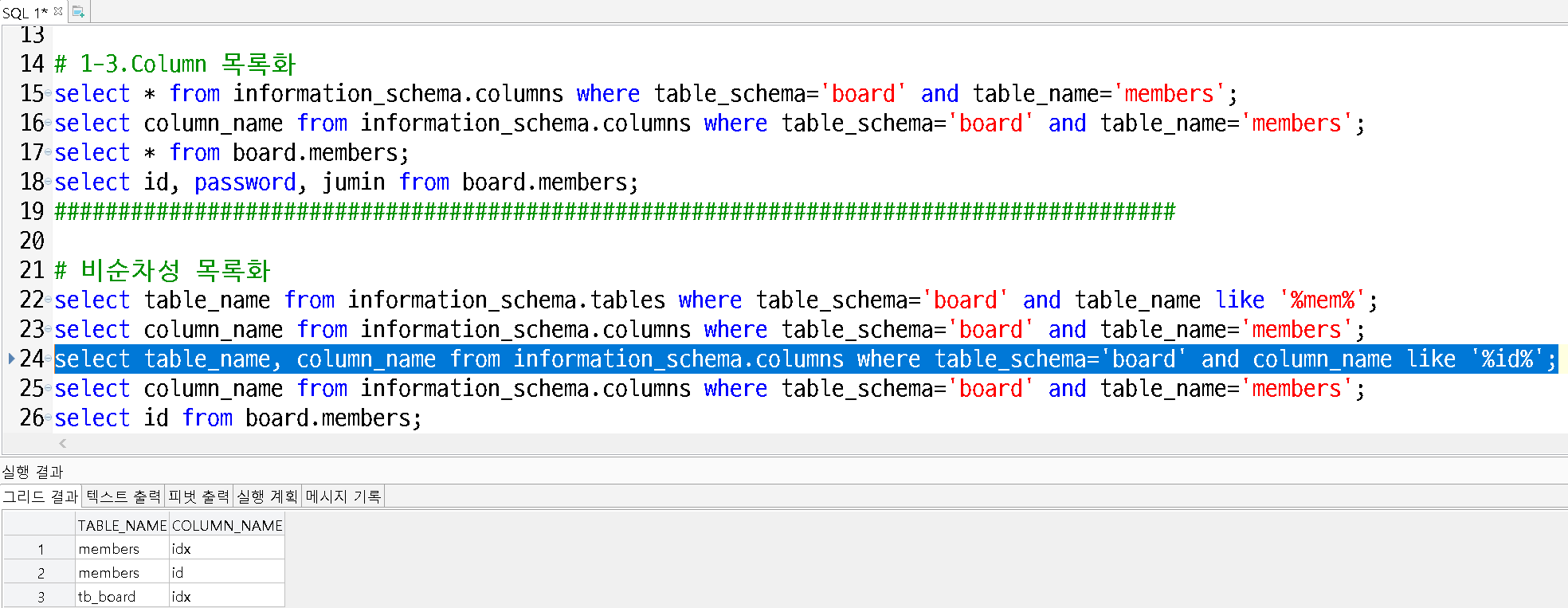 - columns 목록에서 DB명 board, TABLE명 members인 column 이름 조회