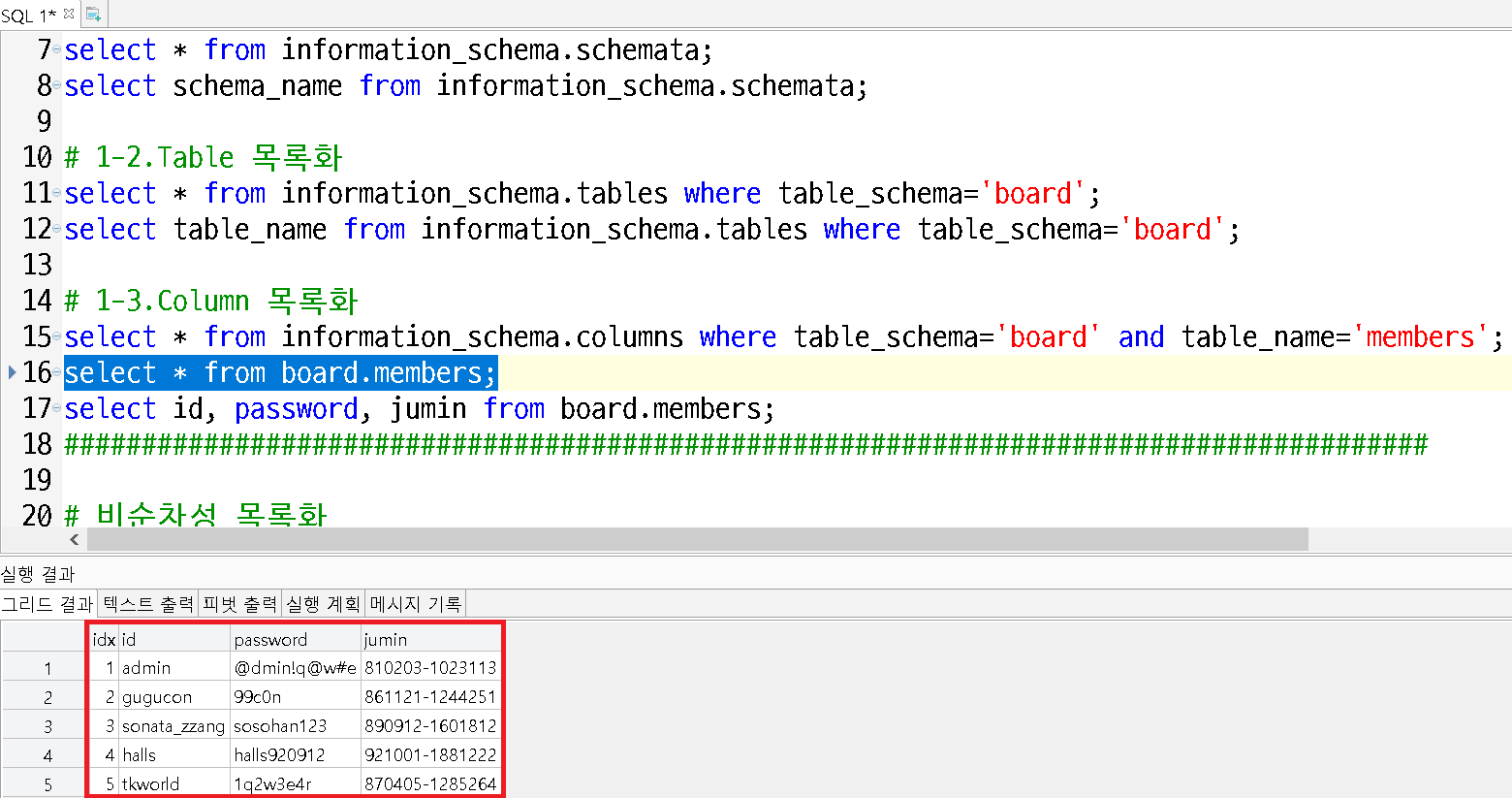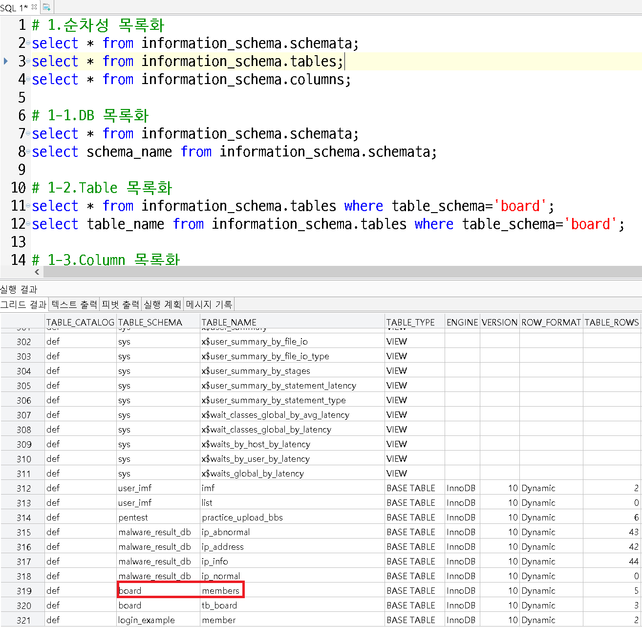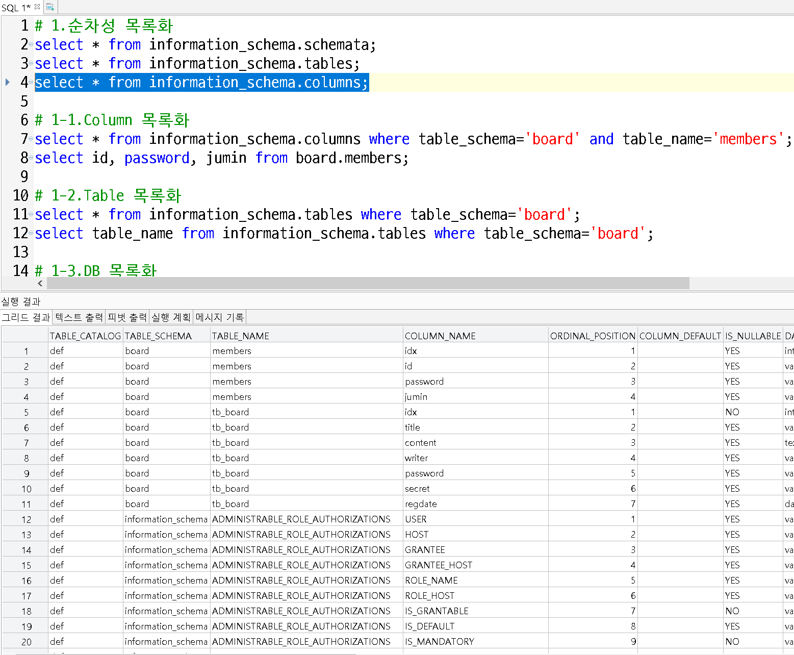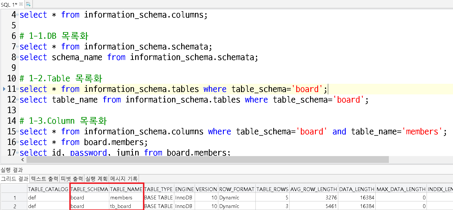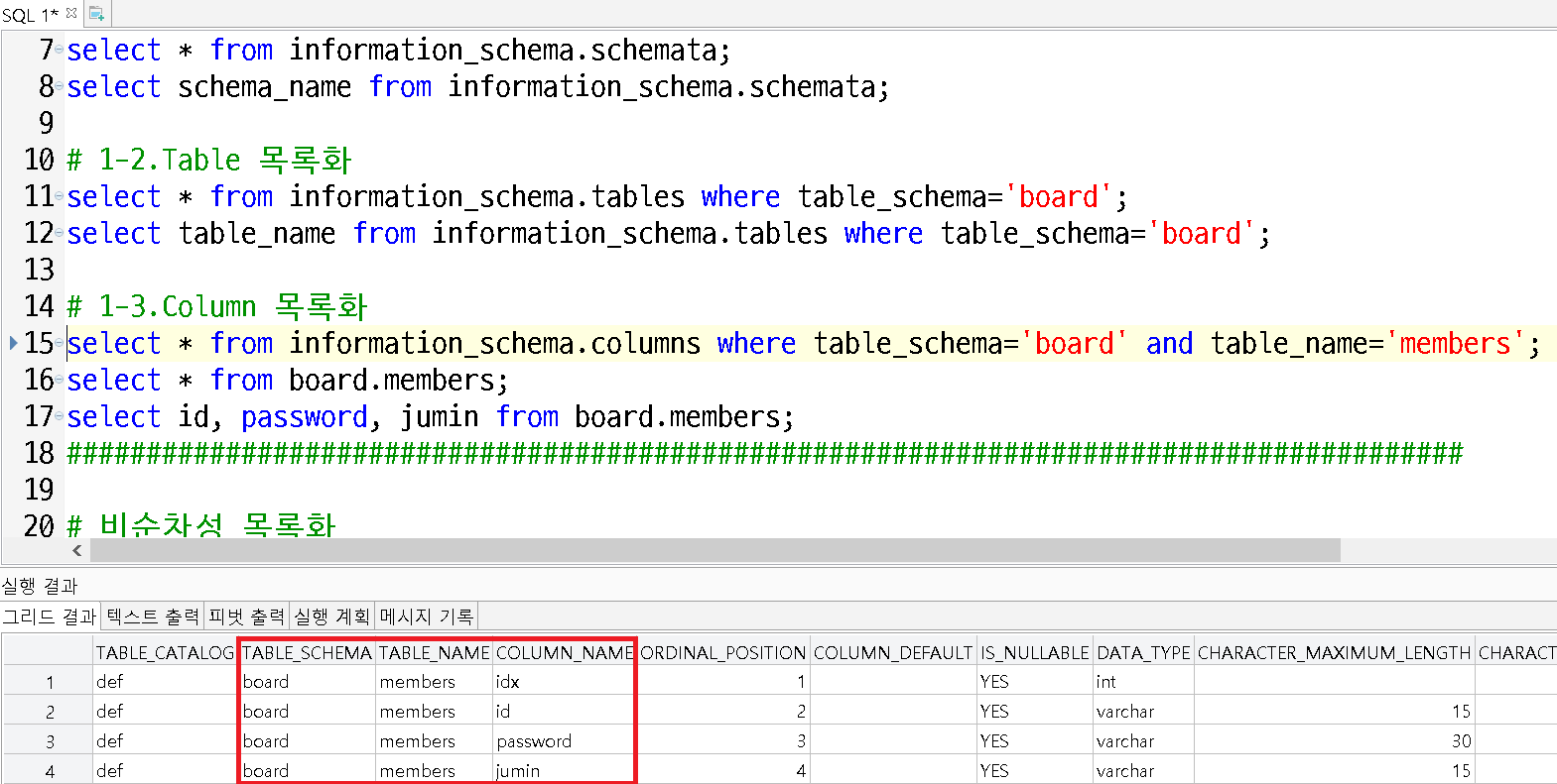 select * from information_schema.columns where table_schema='board' and table_name='members';