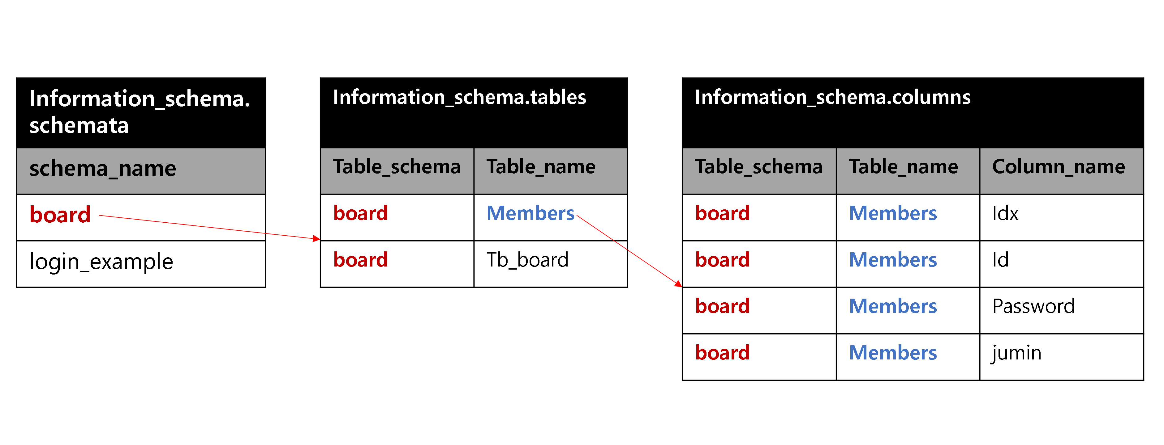 select column_name from information_schema.columns where table_schema='board' and table_name='members';