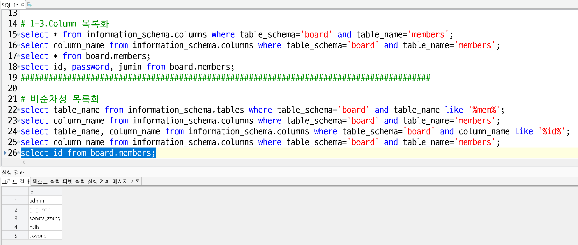 'board' DB의 'members' TABLE의 id 컬럼을 목록화 시킬것이다.