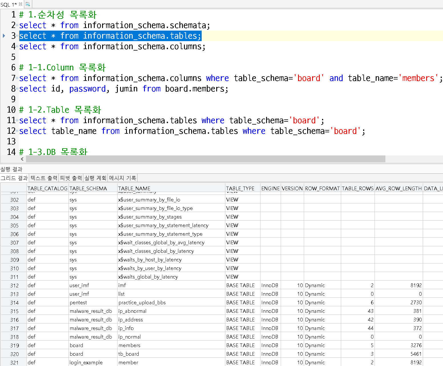 - 테이블에서 DB명 board에 대해서 테이블 이름으로 테이블 목록화