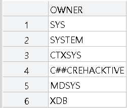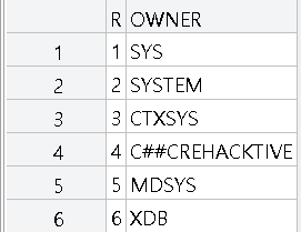 - all_tables에서 owner가 'C##CREHACKTIVE'인 1행