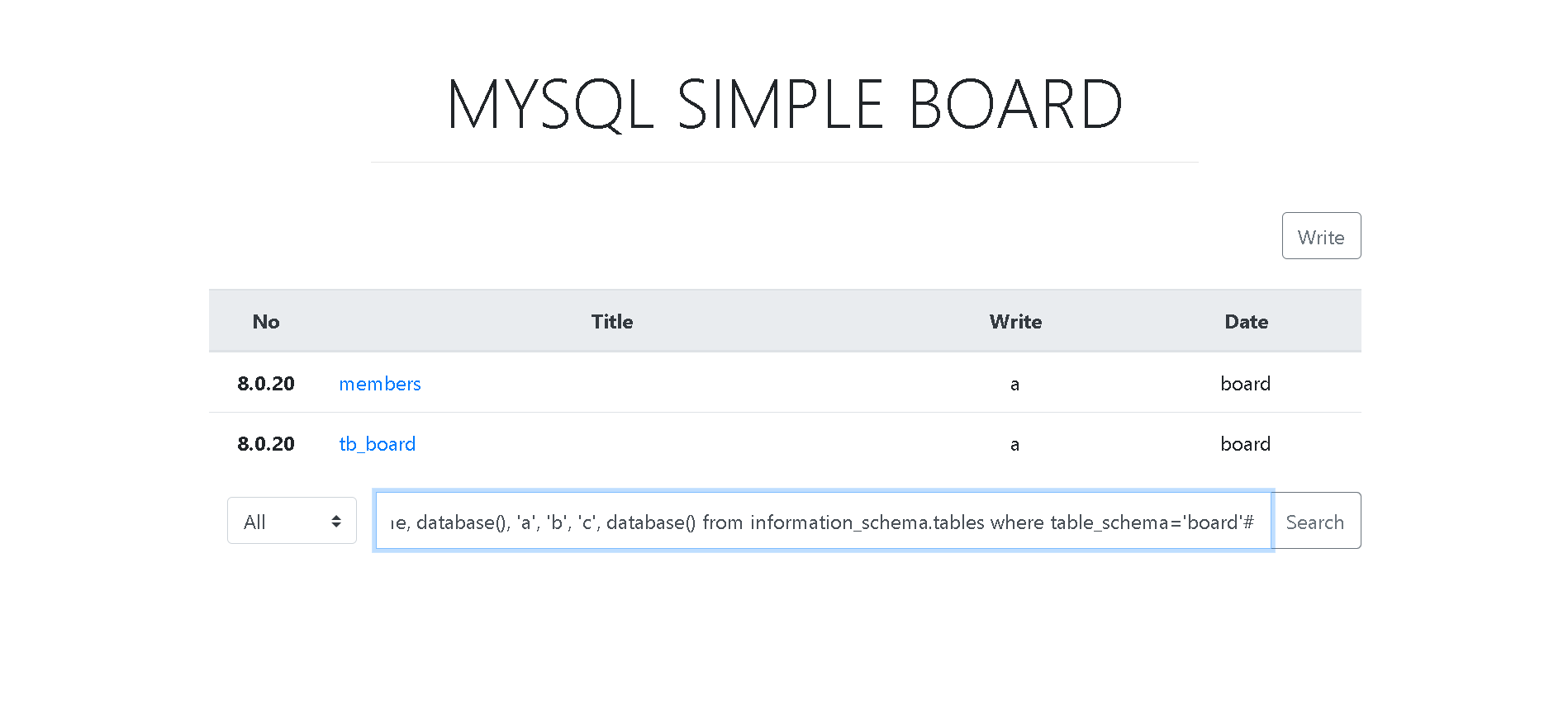 - information_schema.tables에서 'board' DB의 table_name 테이블이름 조회