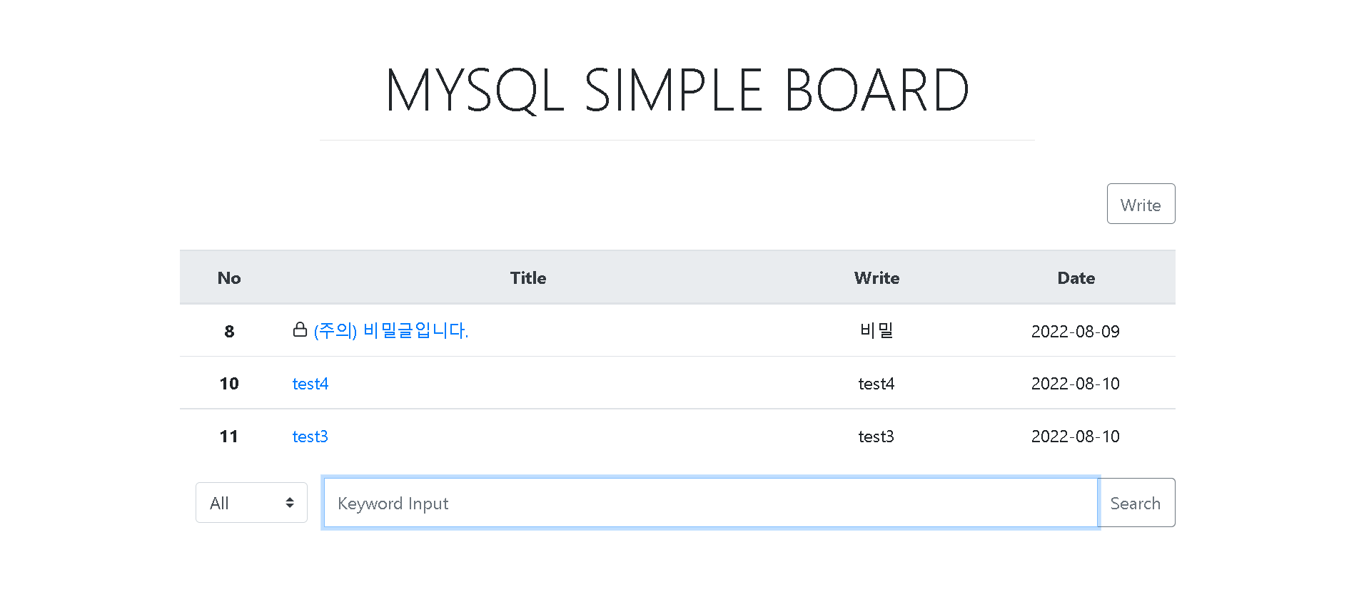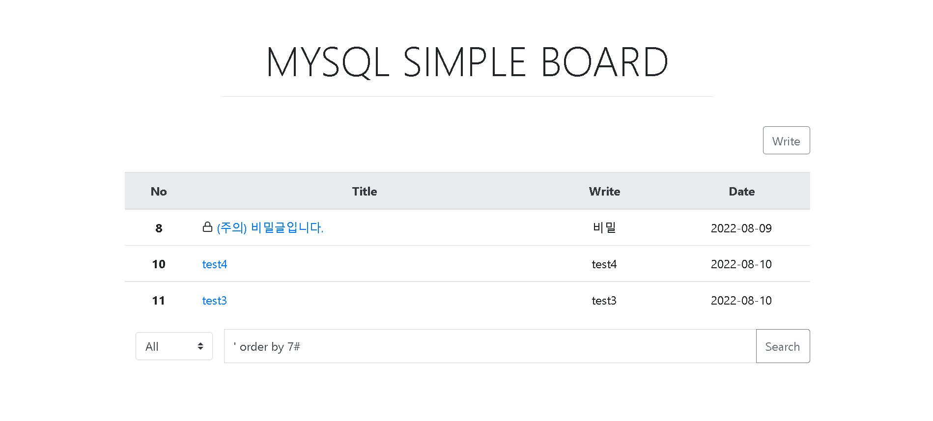 - board.tb_board에서 id, content, password, regdate, secret, title, writer 정보 조회