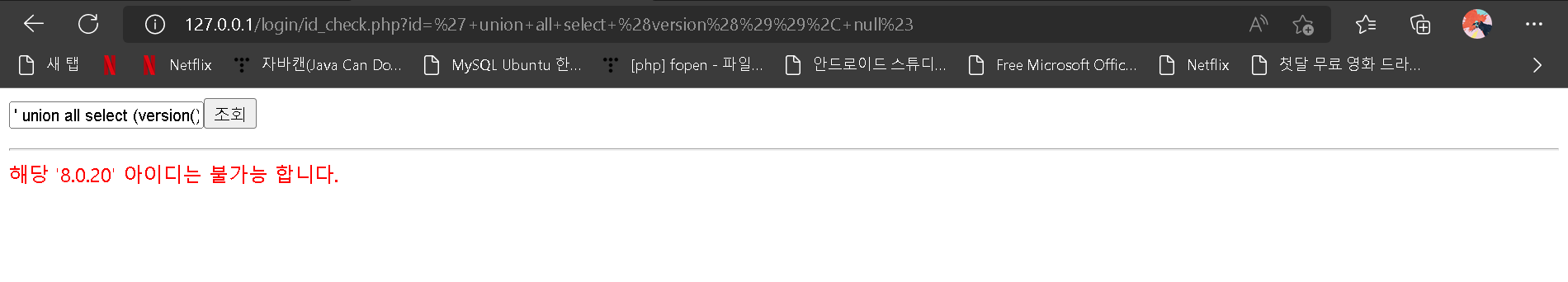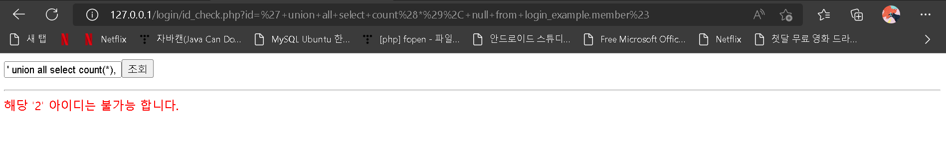 UNION-BASED 공격이 가능한 아이디 중복 조회 기능에 대한 공격 실습 본문