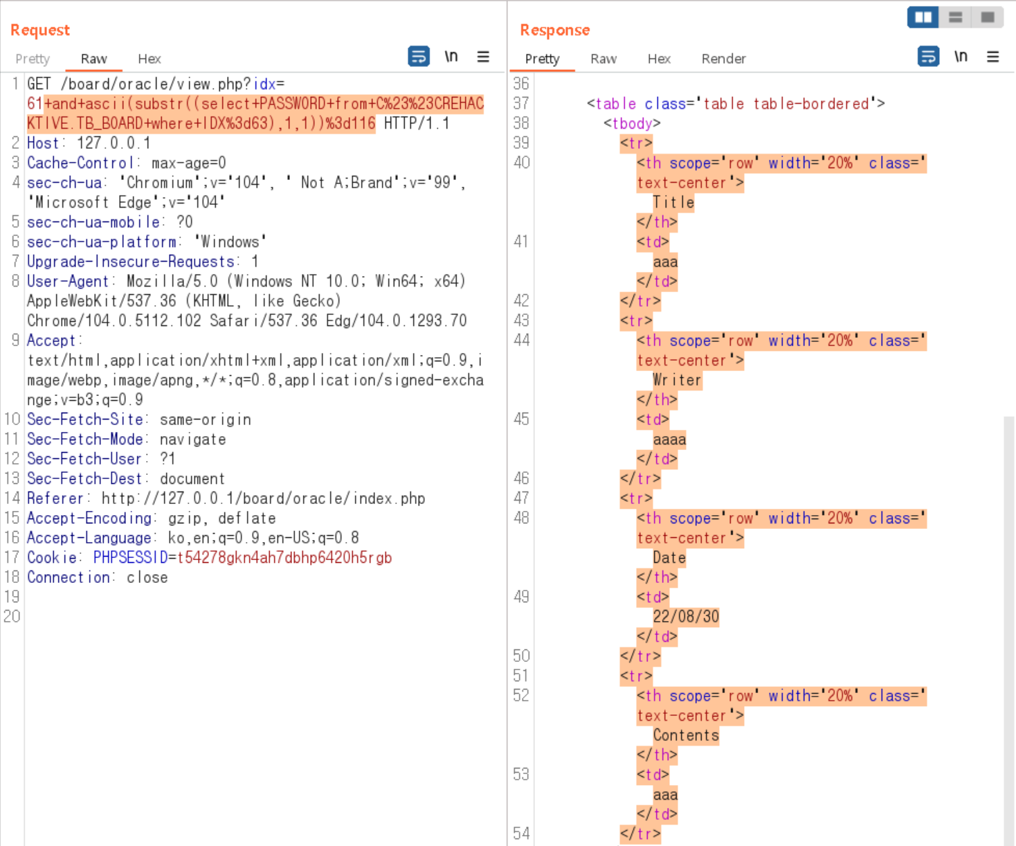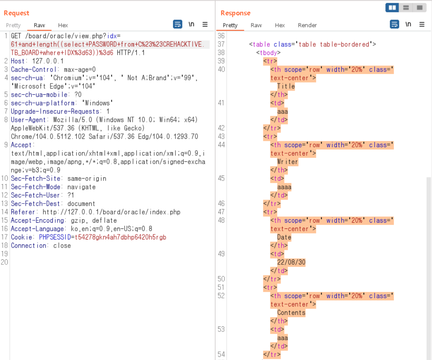 idx=61 and length((select PASSWORD from C##CREHACKTIVE.TB_BOARD where IDX=63))=6